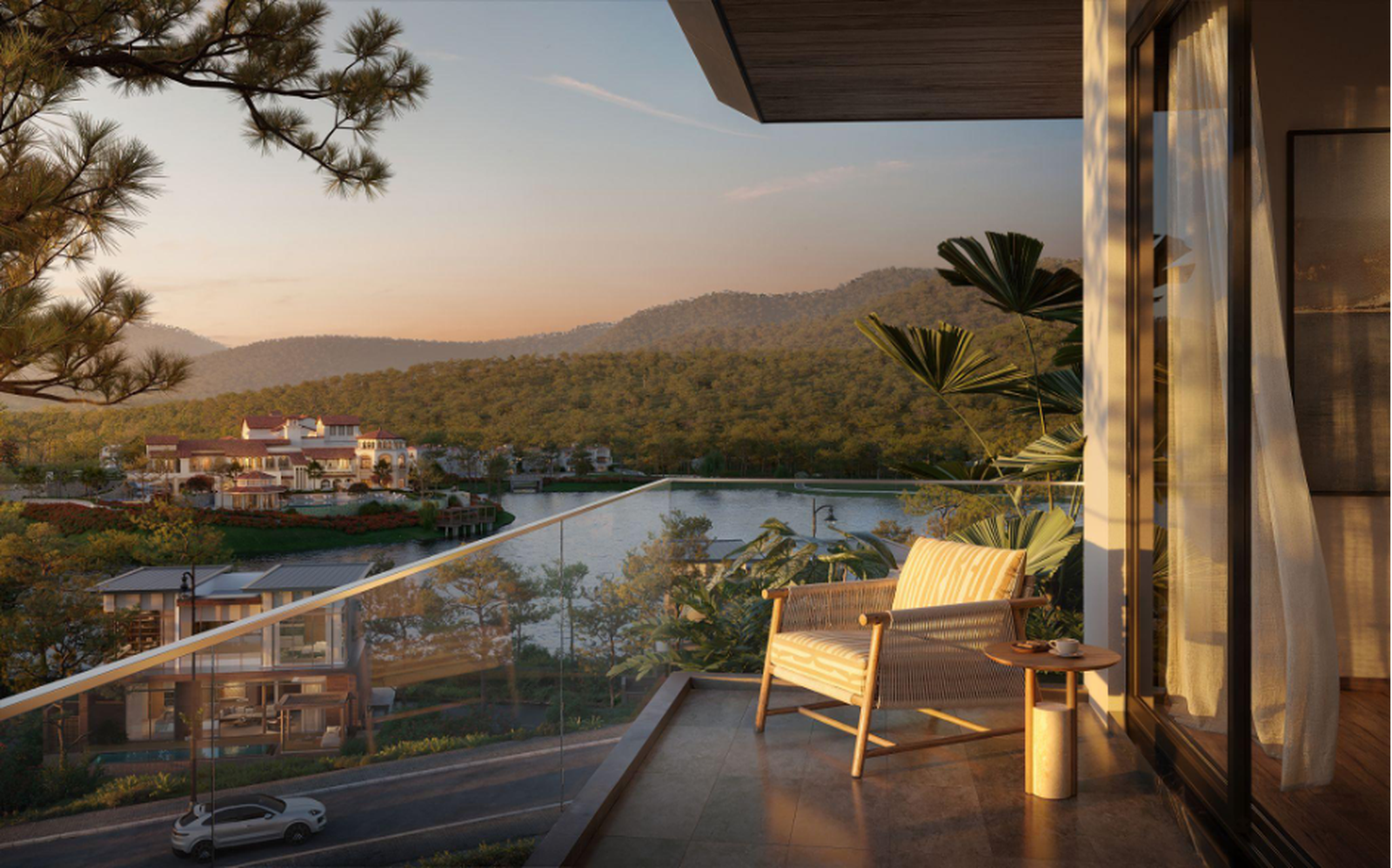 Nhờ hệ mái hiên vươn rộng và cao độ địa hình độc đáo, mỗi căn biệt thự thu trọn tầm nhìn ra hồ Thiều Quang và dãy Tam Đảo.