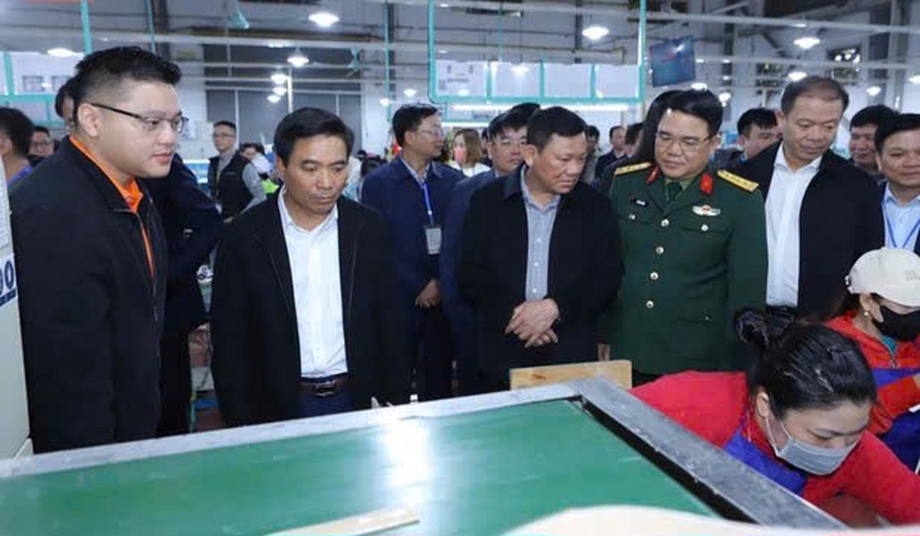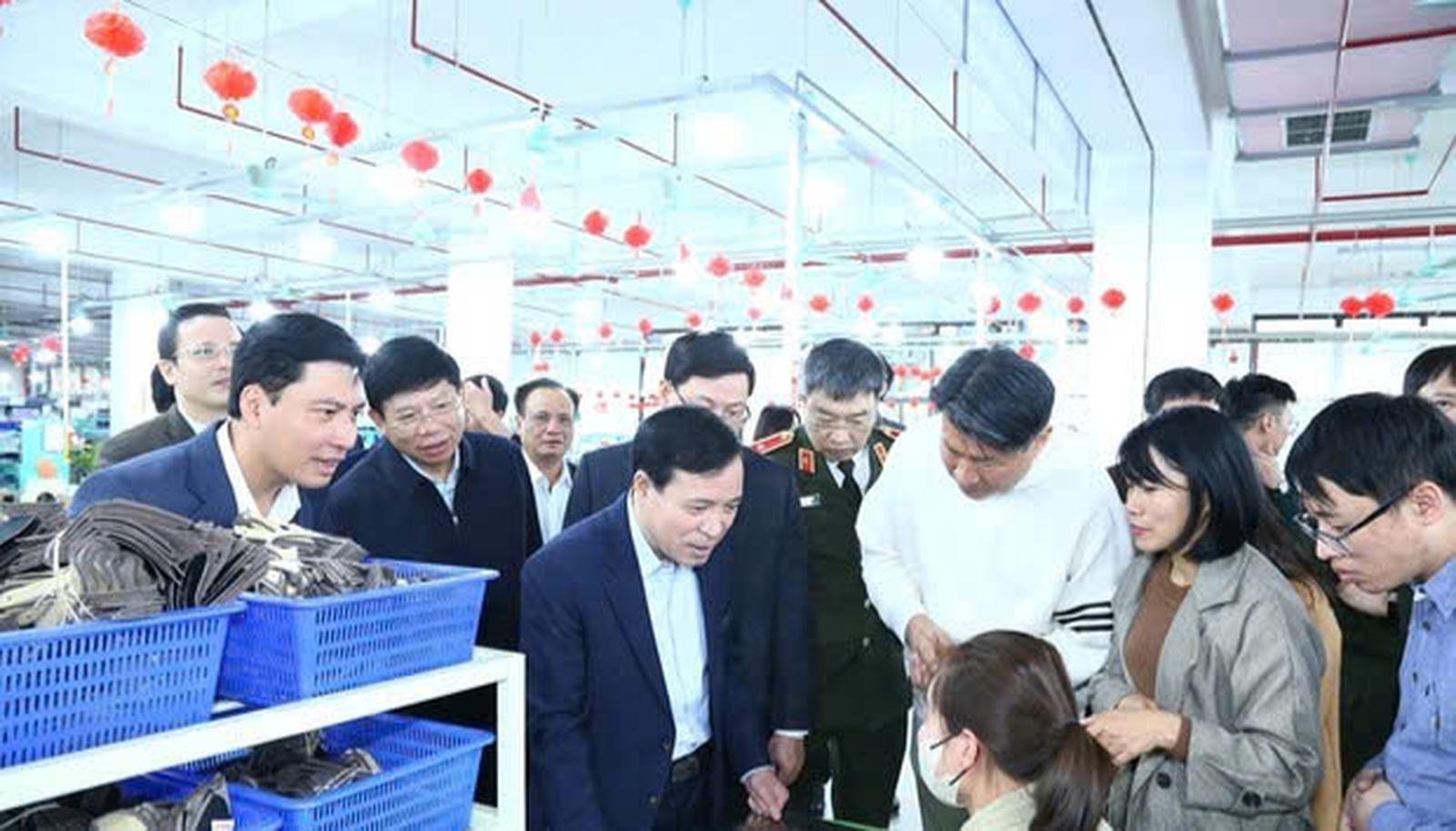 Ông Lại Thế Nguyên, Phó Bí thư Thường trực Tỉnh ủy Thanh Hóa và đoàn công tác kiểm tra tình hình sản xuất đầu xuân tại Công ty TNHH Giầy Alivia Việt Nam. Ảnh: P.V
