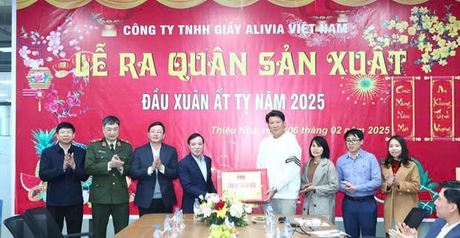 Cũng trong ngày 6/2, ông Lại Thế Nguyên, Phó Bí thư Thường trực Tỉnh ủy, Chủ tịch HĐND tỉnh, Trưởng Đoàn ĐBQH tỉnh Thanh Hóa đã đến dự lễ ra quân sản xuất đầu năm tại Công ty TNHH Giầy Alivia Việt Nam đóng tại huyện Thiệu Hóa.