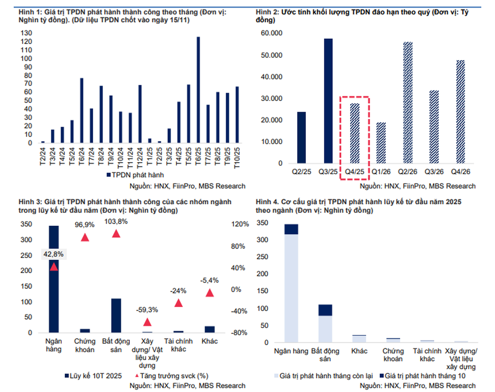Lũy kế 10 tháng đầu năm, thị trường TPDN đạt tổng giá trị phát hành 500,4 nghìn tỷ đồng, tăng 46,5% so với cùng kỳ năm trước. Nhóm ngân hàng tiếp tục dẫn đầu với 345,7 nghìn tỷ đồng (chiếm 69% thị phần), lãi suất bình quân quanh 5,9%/năm và kỳ hạn bình quân 4,5 năm. Các nhà băng phát hành lớn nhất gồm TCB (46 nghìn tỷ), ACB (36,5 nghìn tỷ) và OCB (32,7 nghìn tỷ). Nhóm Bất động sản đứng thứ hai với 110,8 nghìn tỷ đồng (chiếm 22,1%), lãi suất bình quân 10,2%/năm và kỳ hạn bình quân 2,8 năm; trong đó có Vingroup (24 nghìn tỷ), Vinhomes (15 nghìn tỷ) và Trường Minh (10 nghìn tỷ).