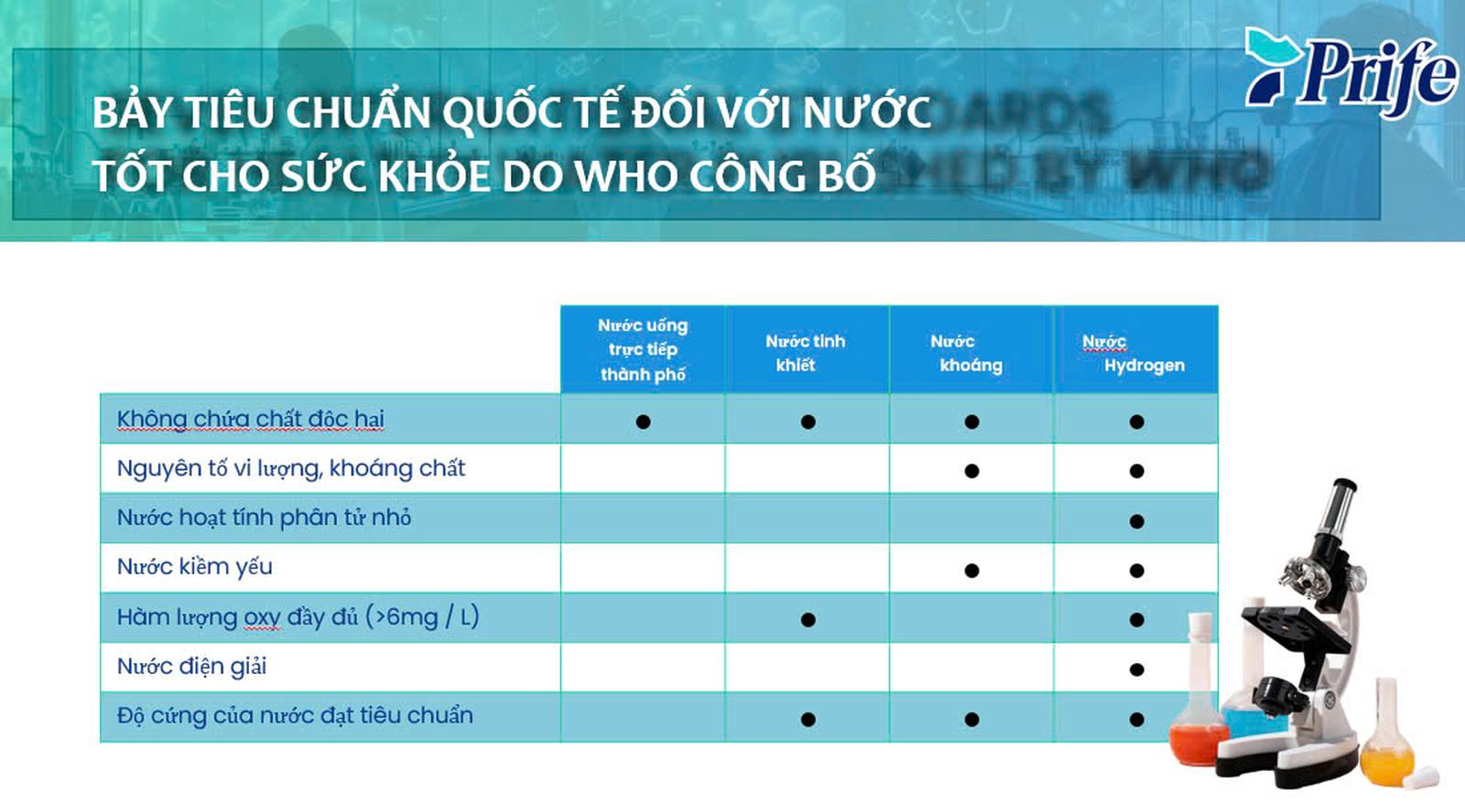 · Bình tạo nước Hydrogen đạt được bảy tiêu chuẩn quốc tế với nước tốt cho sức khỏe do Tổ chức Y tế thế giới (WHO) công bố.