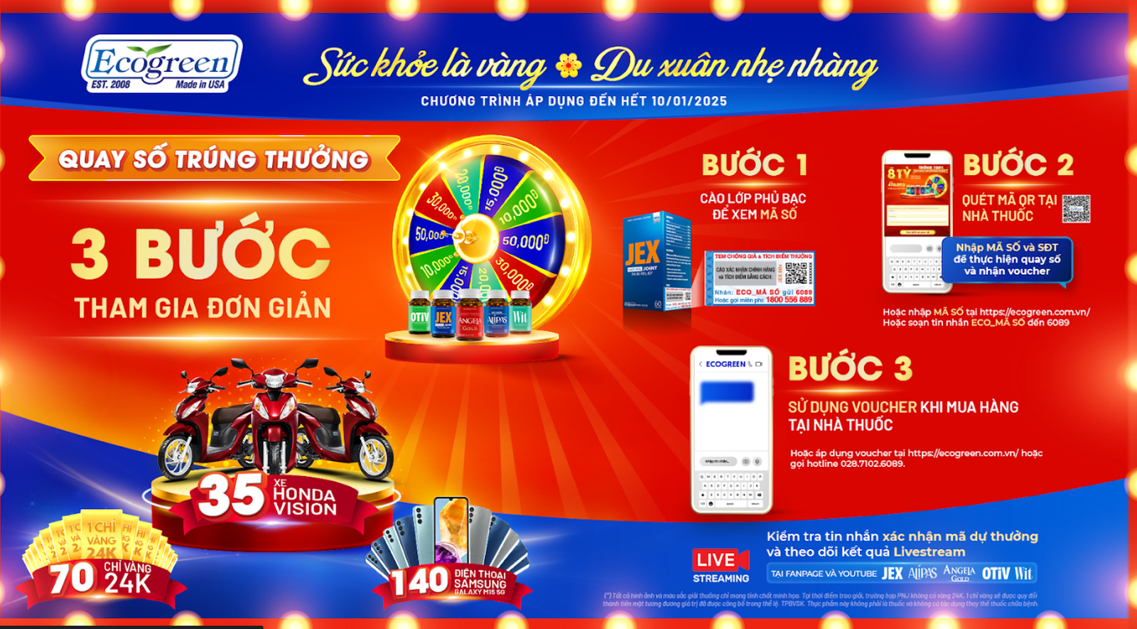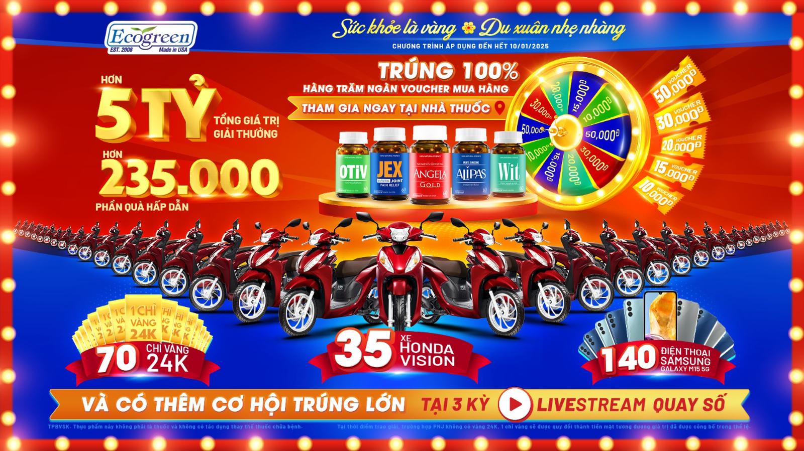 Nhằm tri ân khách hàng đã đồng hành cùng các sản phẩm cao cấp Ecogreen đến từ Mỹ suốt gần 15 năm, ECO Pharma tổ chức Chương trình Quay số trúng thưởng 2024 với cơ hội quay trúng ngay 100% hơn 235.000 voucher và thêm cơ hội trúng thưởng lớn tại livestream quay số: 35 xe Honda Vision, 70 chỉ vàng 24K, 140 điện thoại Samsung Galaxy M15 5G. Đặc biệt, tại livestream chung cuộc lúc 19:00 ngày 13/01/2025, giá trị giải thưởng sẽ được nhân bốn, mang đến phần quà lớn chưa từng có!