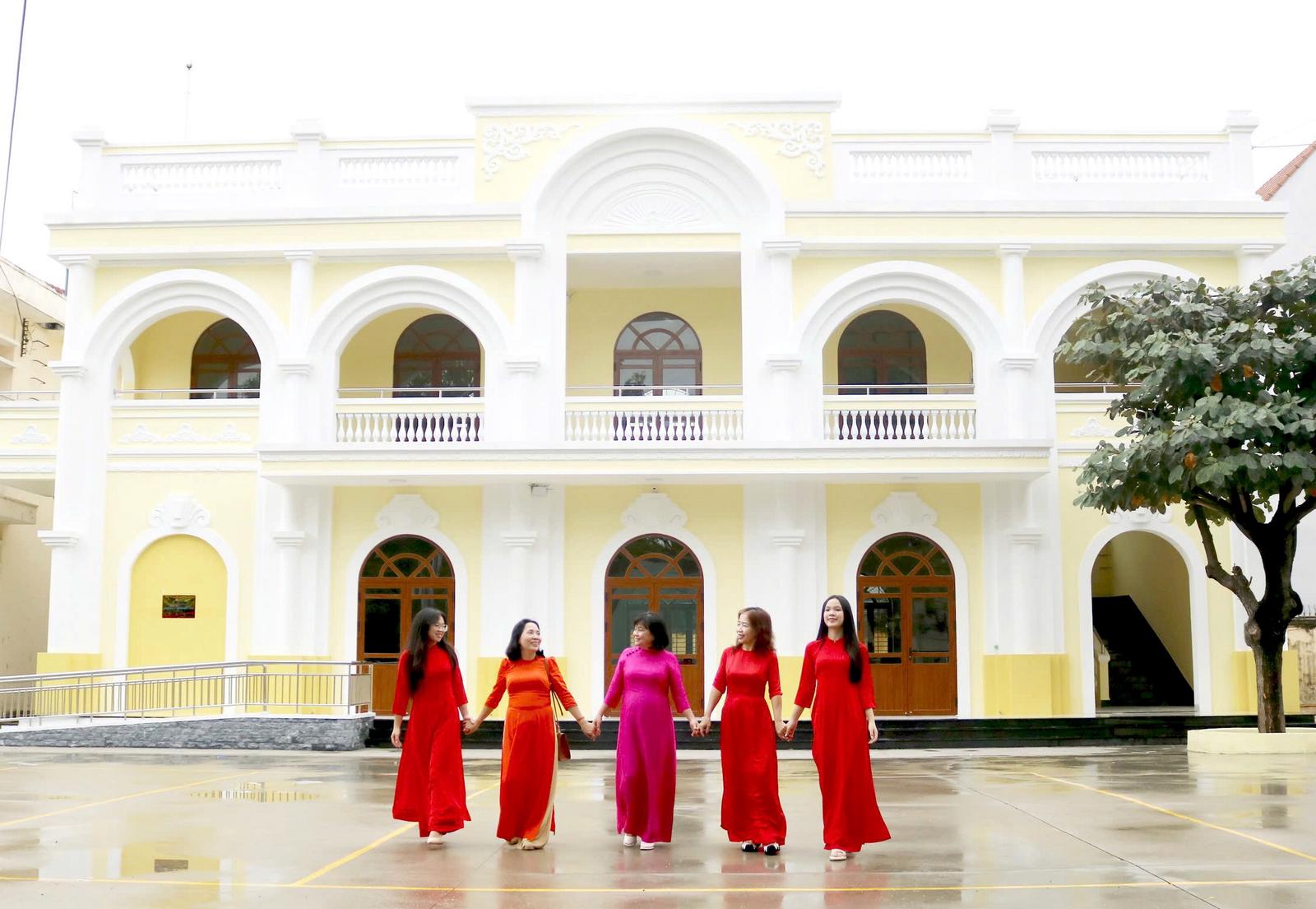 Các cô giáo và học sinh trường Quốc học Quy Nhơn hân hoan bên công trình mới
