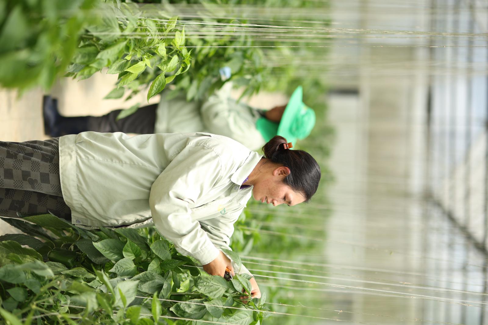 Các công nhân tại WinEco đang tất bật thu hoạch những luống rau mầm xanh ươm sau quá trình vun trồng với quy trình nghiêm ngặt “3 kiểm soát - 4 không” từ nông trường công nghệ cao - Ảnh H.Q