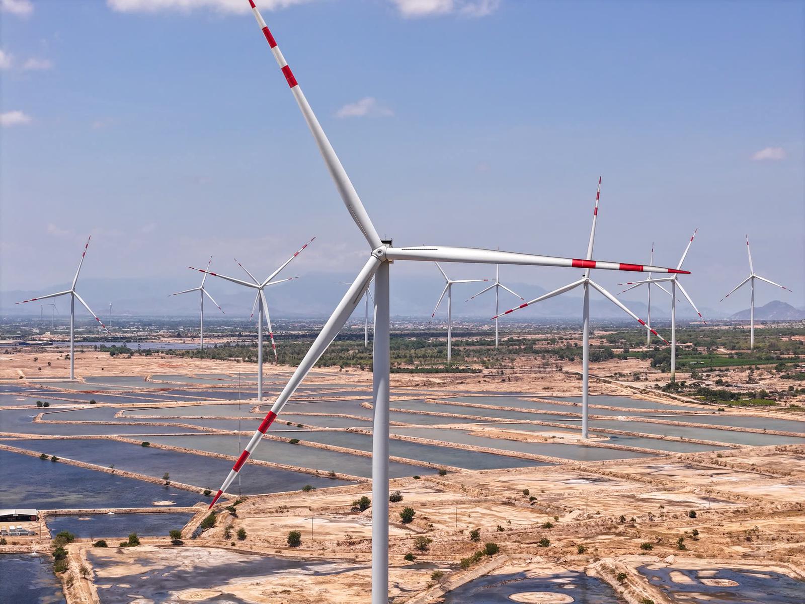 Những cột phong điện vươn mình trên cánh đồng sản xuất muối – biểu tượng cho tầm nhìn đầu tư dài hạn của BIM Group tại Ninh Thuận.