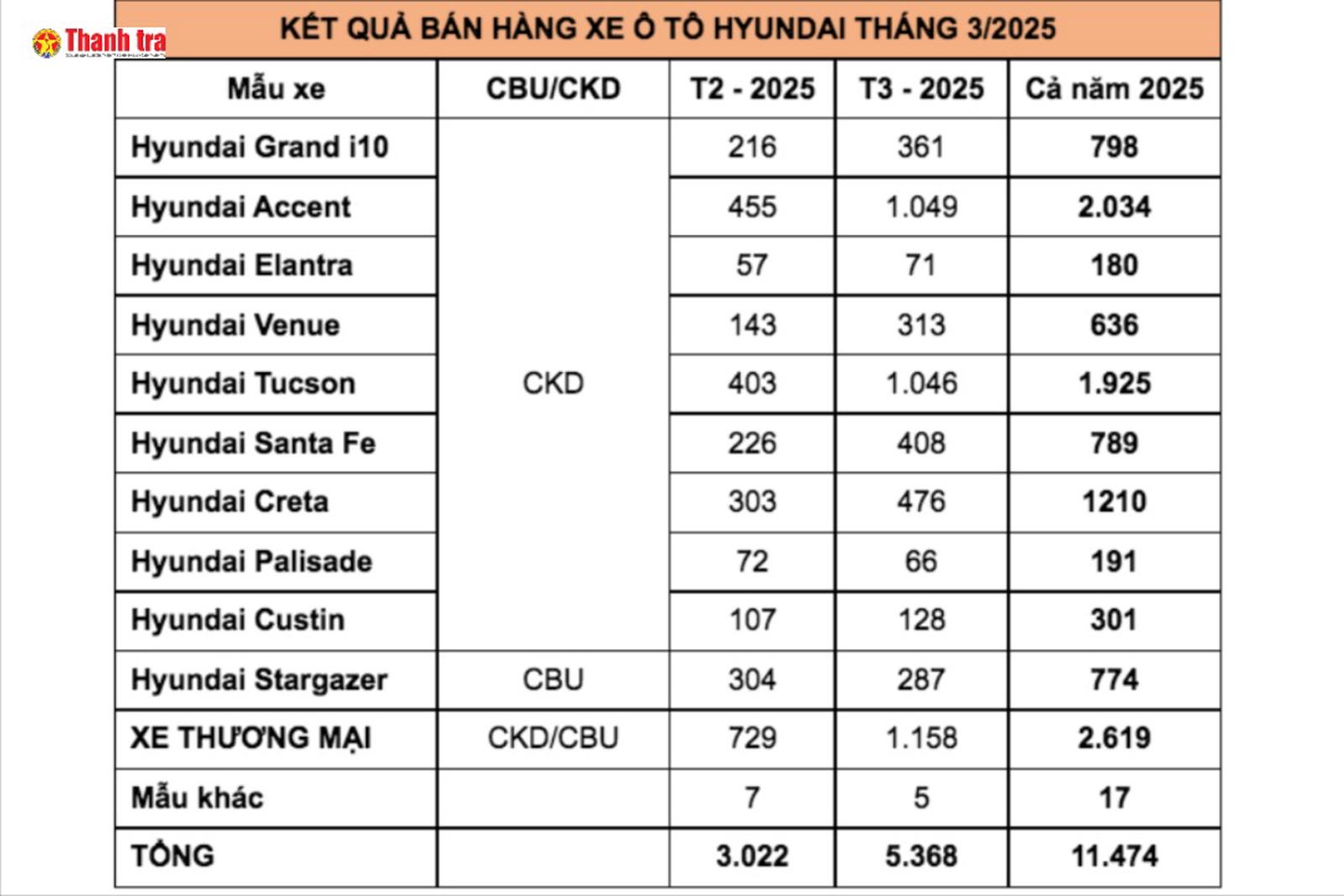 Doanh số bán hàng các mẫu xe Hyundai trong tháng 3/2025. Ảnh: TC