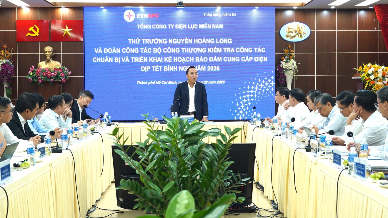 (Thanh tra) - Kiểm tra công tác chuẩn bị và triển khai kế hoạch đảm bảo cung cấp điện Tết Bính Ngọ 2026 tại Tổng Công ty Điện lực miền Nam (EVNSPC) vào sáng 13/2/2026, Thứ trưởng Bộ Công Thương Nguyễn Hoàng Long biểu dương và đánh giá cao sự chuẩn bị kỹ lưỡng, từ sớm, từ xa các phương án đảm bảo điện trong dịp Tết 2026 của EVNSPC.