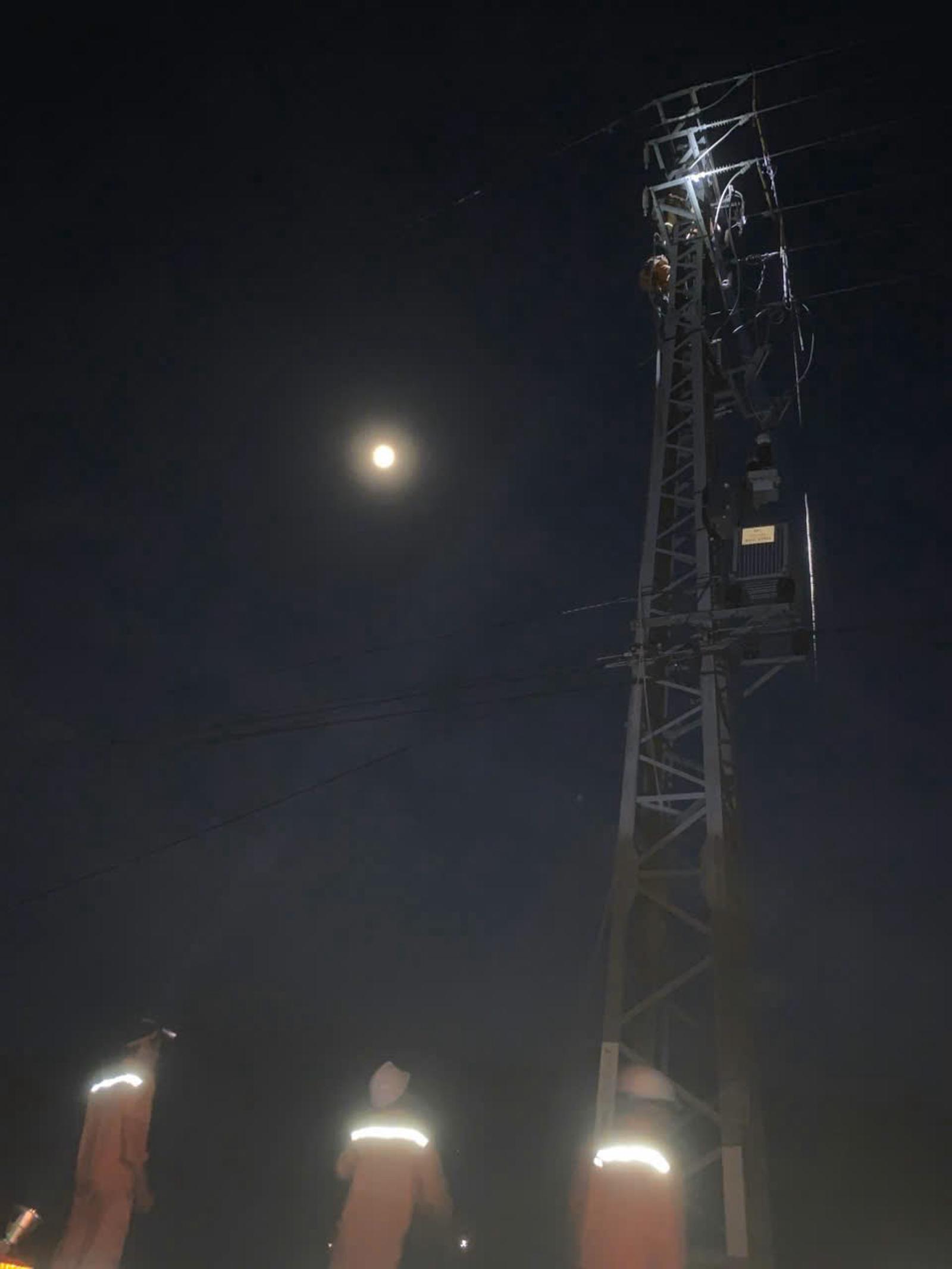 Công nhân điện lực miền Bắc làm việc xuyên đêm để khắc phục sự cố lưới điện. Nguồn: EVNNPC