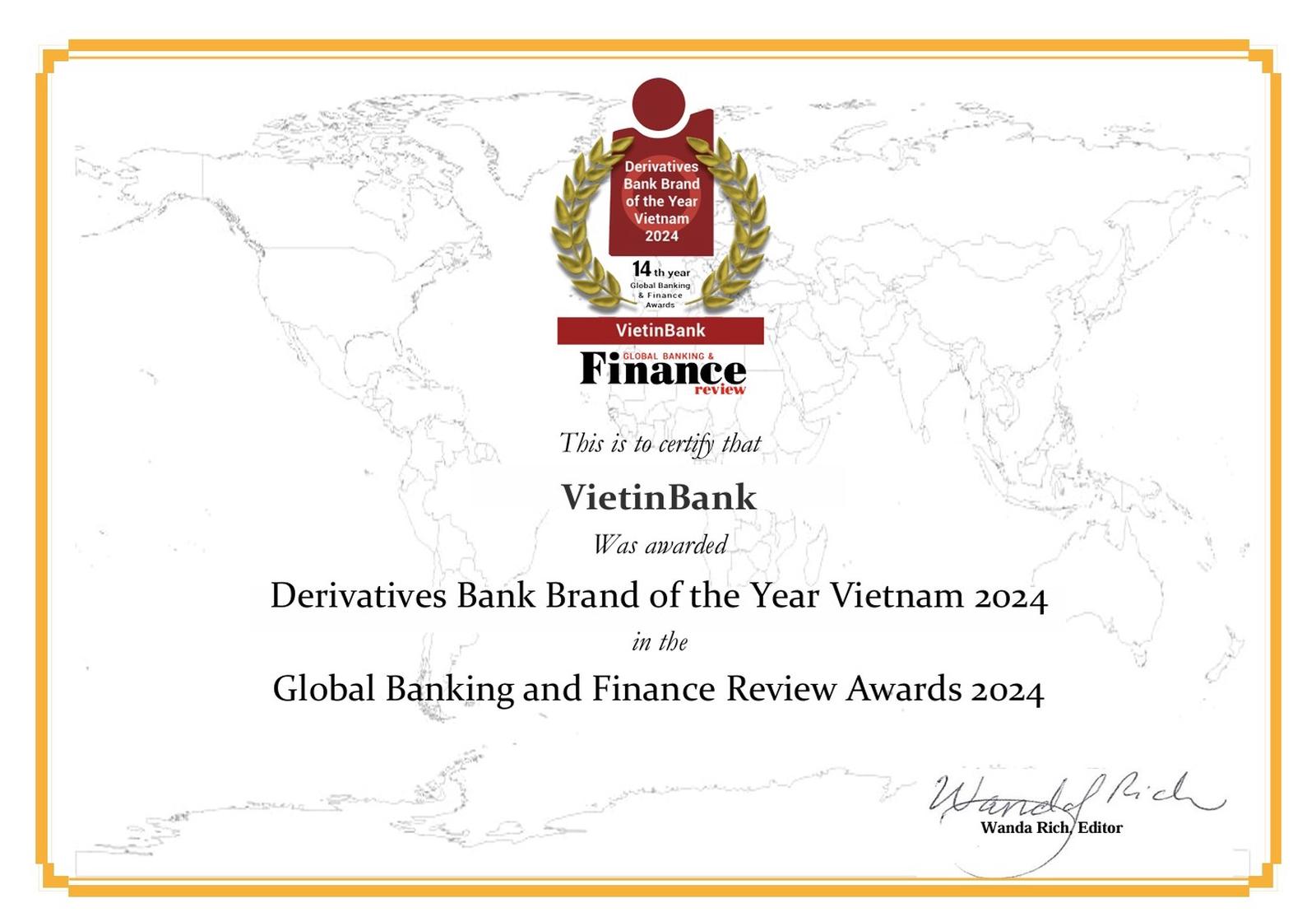 Global Banking & Finance Review vinh danh VietinBank hạng mục “Ngân hàng cung ứng sản phẩm phái sinh tốt nhất Việt Nam năm 2024”