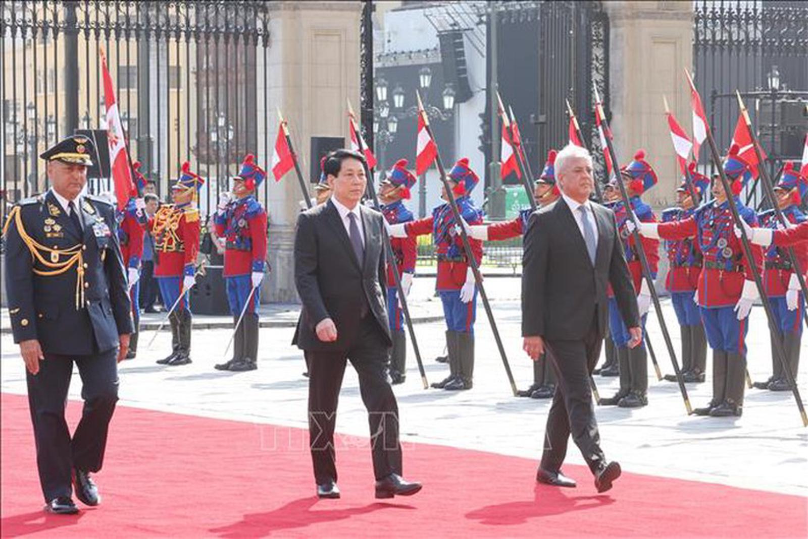 Chiều ngày 13/11 (theo giờ địa phương), tại Phủ Tổng thống Casa de Pizarro ở Thủ đô Lima, Tổng thống Peru Dina Ercilia Boluarte Zegarra đã chủ trì lễ đón trọng thể Chủ tịch nước Lương Cường cùng Đoàn Đại biểu cấp cao Việt Nam thăm chính thức Cộng hòa Peru.