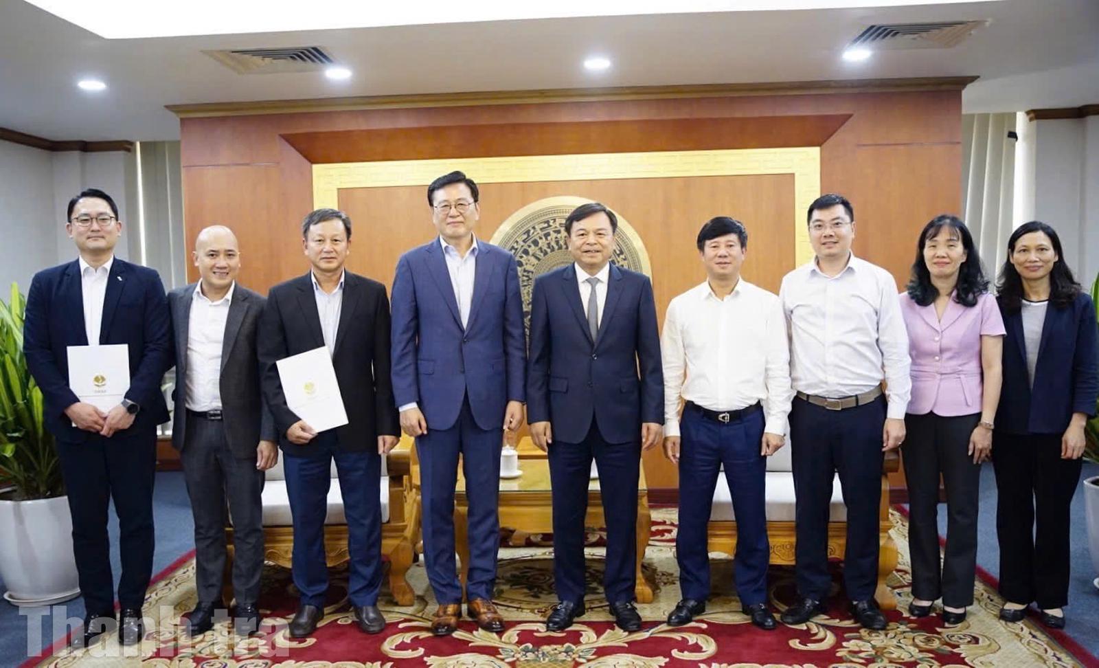 Thứ trưởng Nguyễn Hoàng Hiệp tiếp nhận khoản hỗ trợ 110 triệu won từ lãnh đạo Công ty TNHH S-TEC System (Hàn Quốc). Ảnh: PV