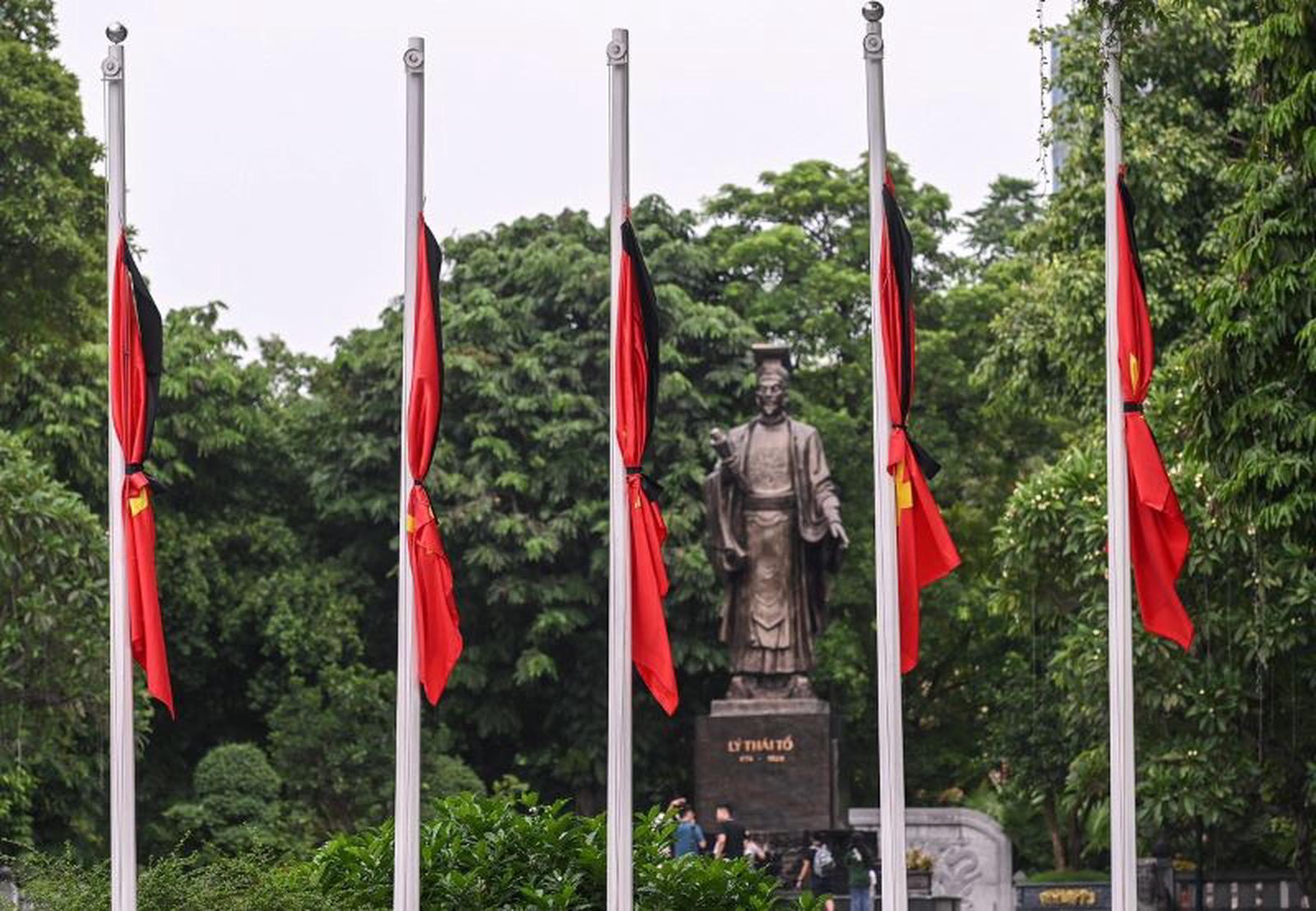 Treo cờ rủ trước vườn hoa Lý Thái Tổ, tưởng nhớ Tổng Bí thư Nguyễn Phú Trọng. Ảnh: Đ.X