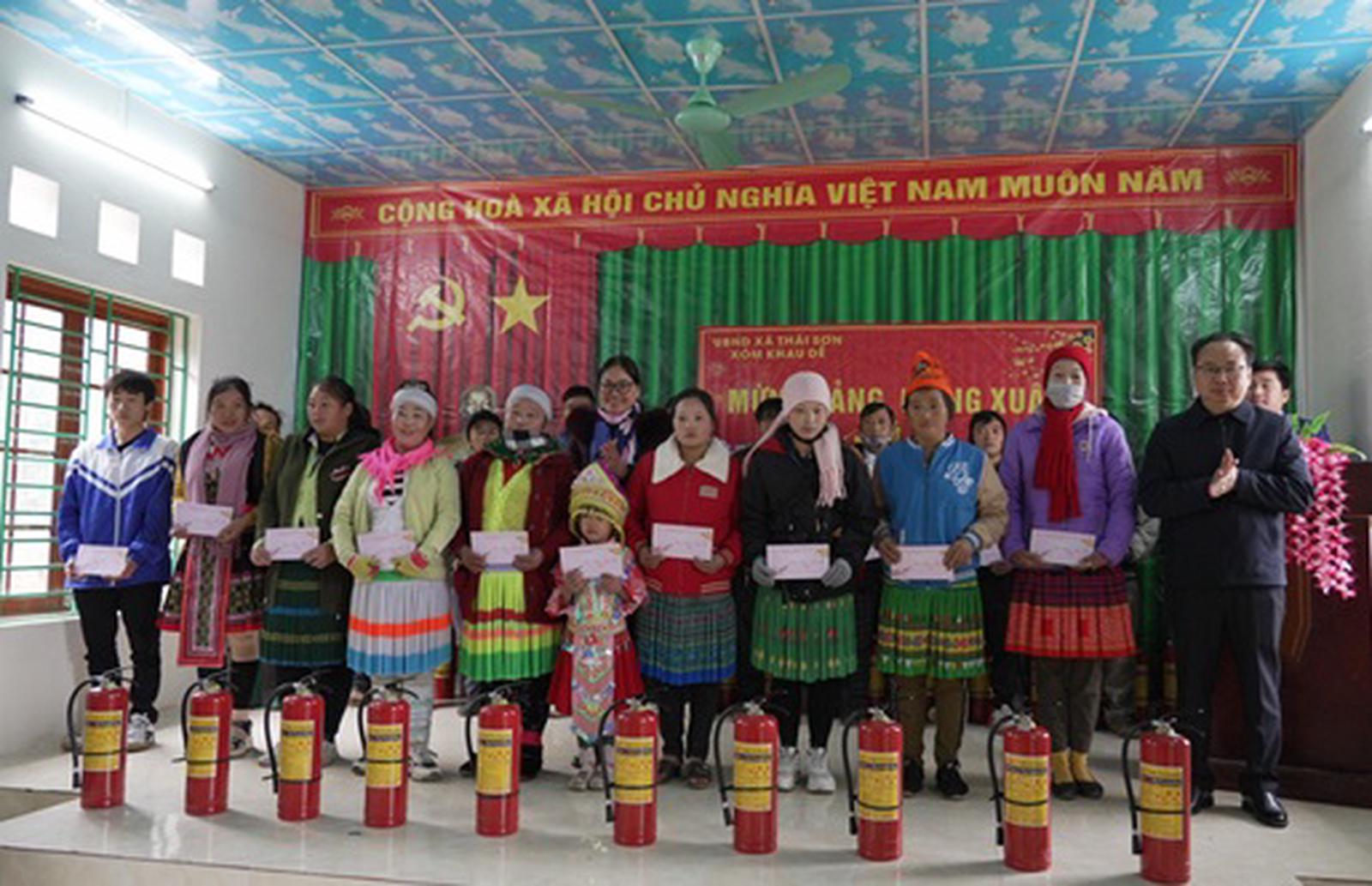 Tặng quà của Công an tỉnh cho UBND xã, Công an xã, 2 điểm trường Khau Dề mỗi suất quà trị giá 5 triệu đồng, tặng 100 bình chữa cháy, 110 cờ Tổ quốc, 300 móc khoá an ninh trật tự cho các hộ gia đình xóm Khau Dề.
