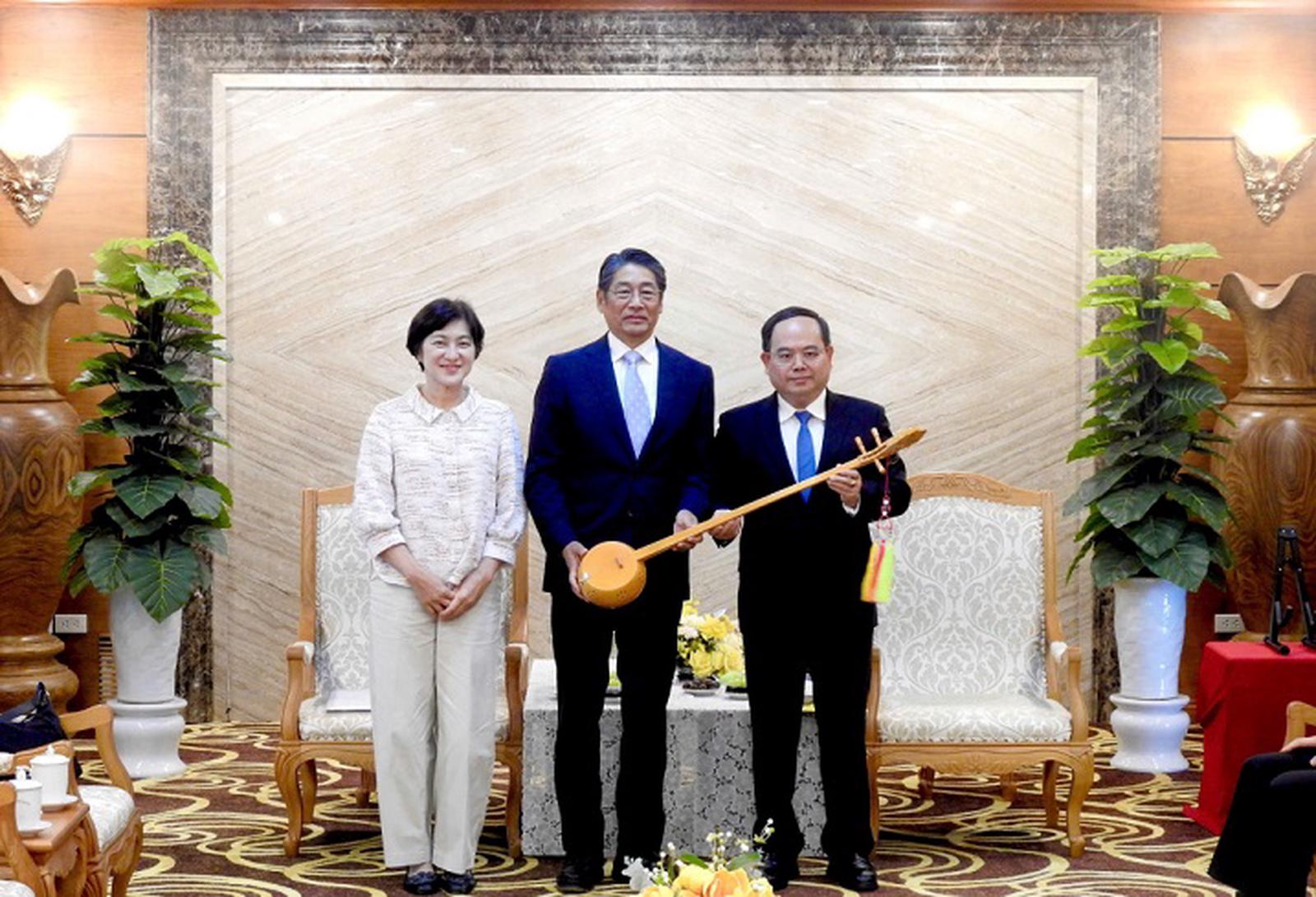 Bí thư Tỉnh ủy Quản Minh Cường tặng quà lưu niệm Đại sứ đặc mệnh toàn quyền Nhật Bản tại Việt Nam ITO Naoki và phu nhân. Ảnh: BCB