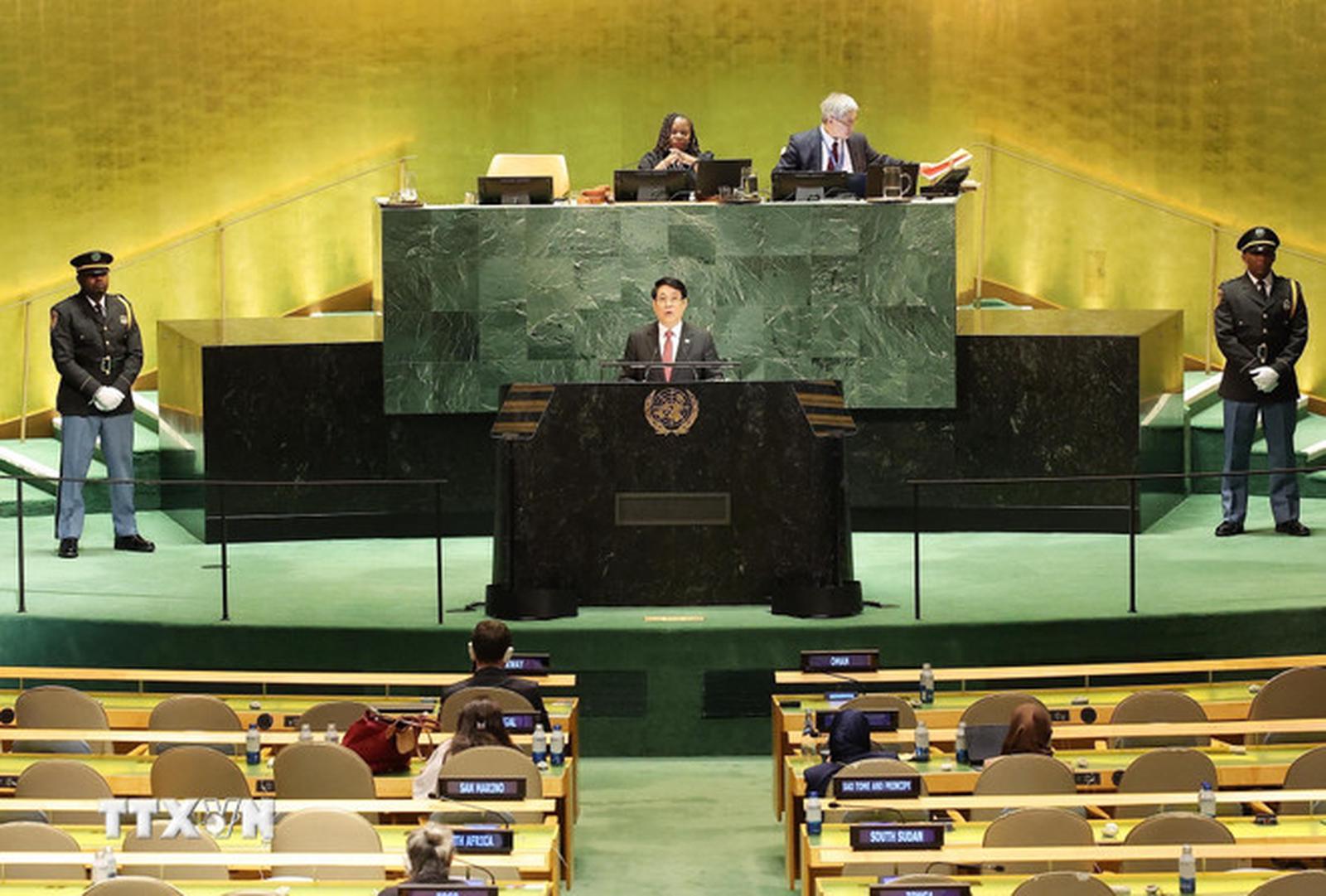 Chủ tịch nước Lương Cường phát biểu tại Phiên Thảo luận chung cấp cao Đại hội đồng Liên hợp quốc Khóa 80. Ảnh: Lâm Khánh/TTXVN