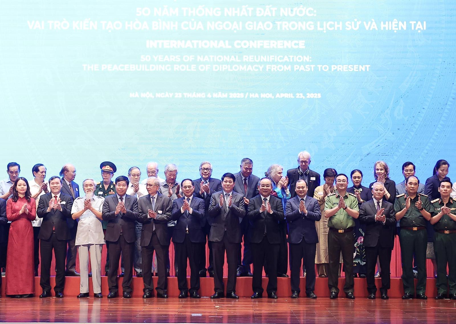 Chủ tịch nước Lương Cường chụp ảnh lưu niệm cùng các đại biểu dự Hội thảo khoa học quốc tế “50 năm thống nhất đất nước: Vai trò kiến tạo hòa bình của ngoại giao trong lịch sử và hiện tại”. Ảnh: Lâm Khánh/TTXVN