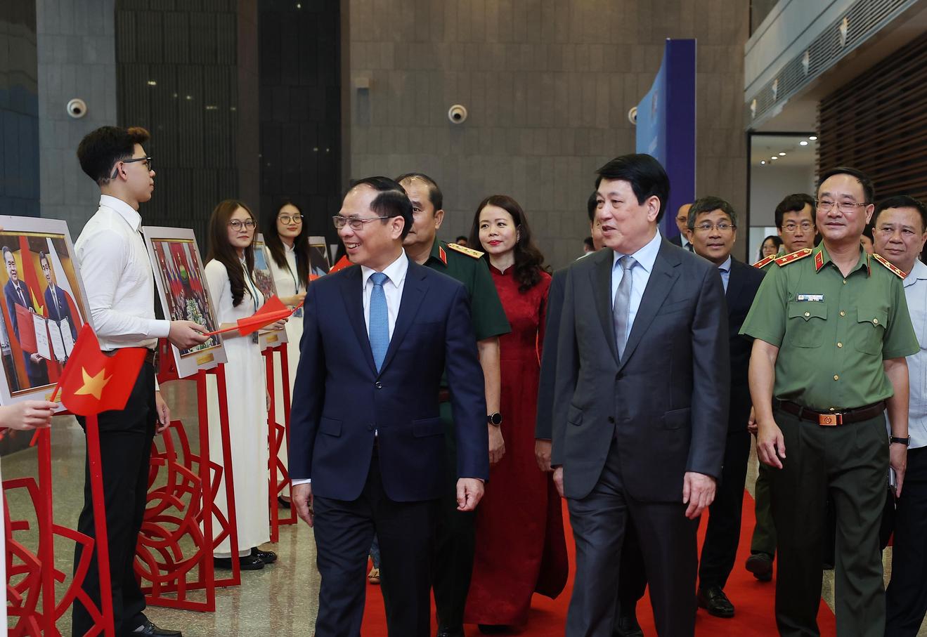 Chủ tịch nước Lương Cường dự Hội thảo khoa học quốc tế “50 năm thống nhất đất nước: Vai trò kiến tạo hòa bình của ngoại giao trong lịch sử và hiện tại”. Ảnh: Lâm Khánh/TTXVN