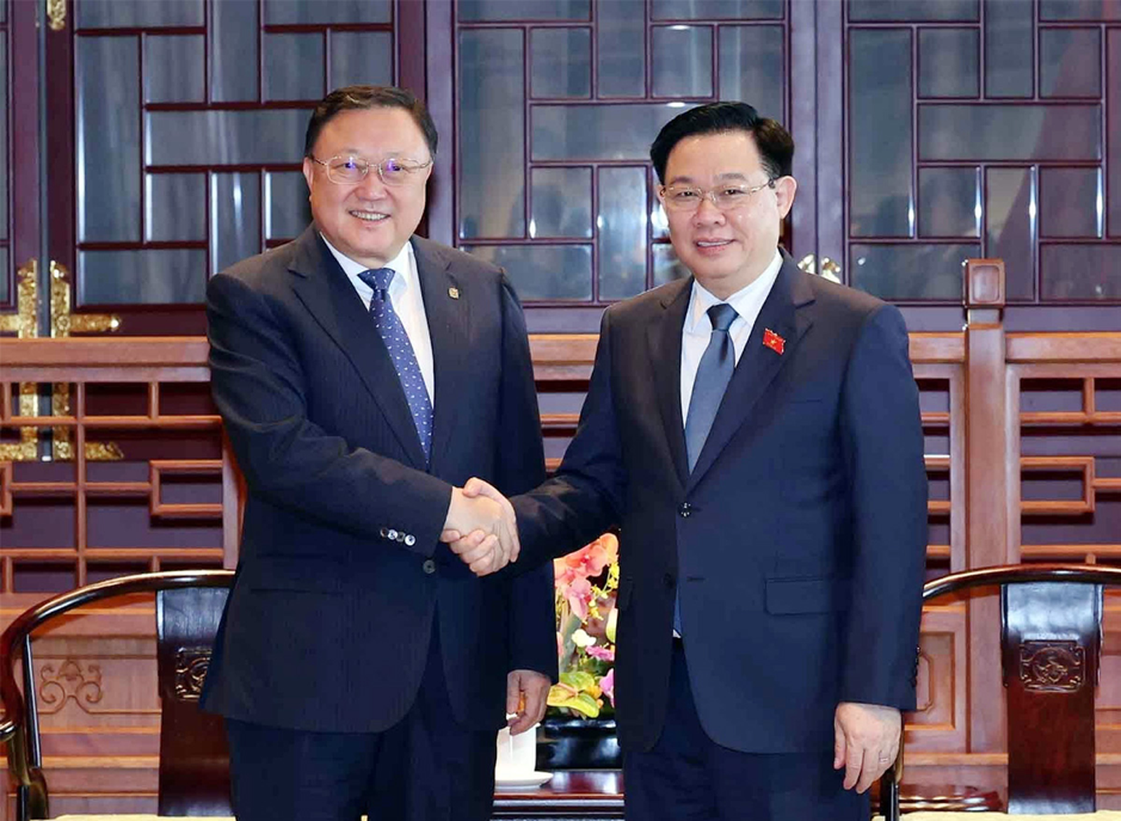 Chủ tịch Quốc hội Vương Đình Huệ với Chủ tịch Hội đồng quản trị Tập đoàn Xây dựng giao thông Trung Quốc (CCCC) Vương Đồng Trụ. Ảnh: TTXVN