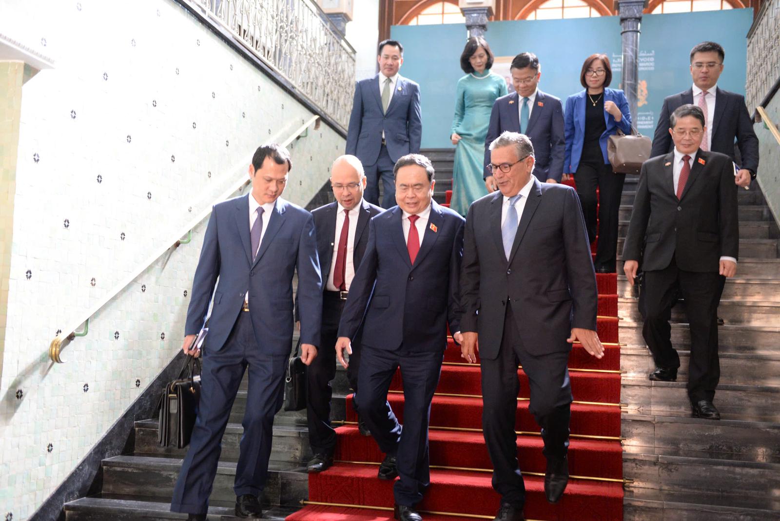 Chủ tịch Quốc hội Trần Thanh Mẫn bày tỏ vinh dự được thay mặt lãnh đạo Đảng, Nhà nước Việt Nam thăm chính thức Morocco; đồng thời gửi lời thăm hỏi của Tổng Bí thư Tô Lâm, Chủ tịch nước Lương Cường và Thủ tướng Chính phủ Phạm Minh Chính tới Quốc vương Mohammed VI và Thủ tướng Aziz Akhannouch.