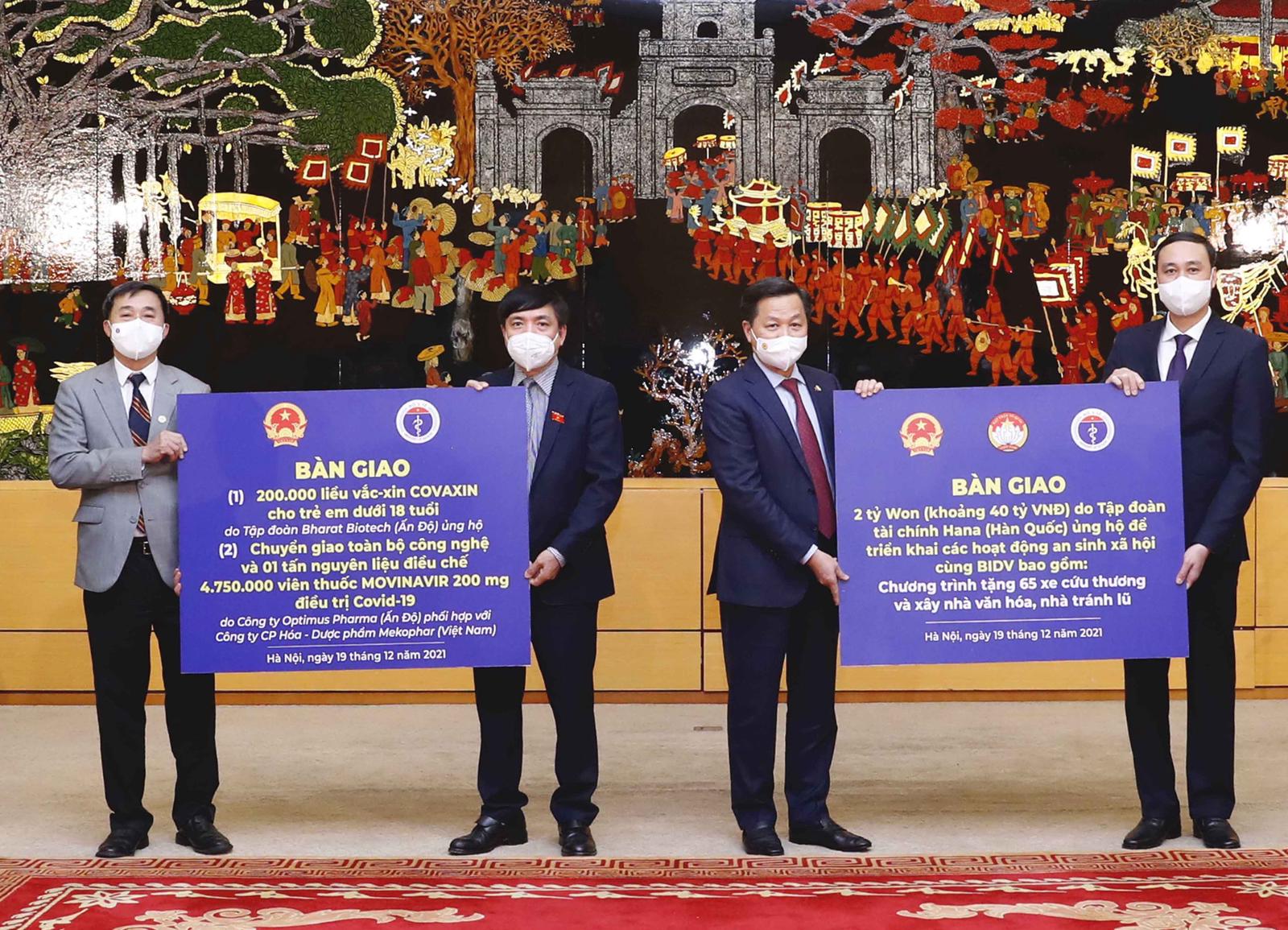 Phó Thủ tướng Lê Minh Khái và Tổng Thư ký - Chủ nhiệm Văn phòng Quốc hội Bùi Văn Cường thay mặt Đoàn Công tác trao tặng vaccine, thiết bị vật tư y tế và tiền mặt do các doanh nghiệp Hàn Quốc và Ấn Độ tặng Việt Nam nhân chuyến công tác của Chủ tịch Quốc hội. Ảnh: D.Tấn