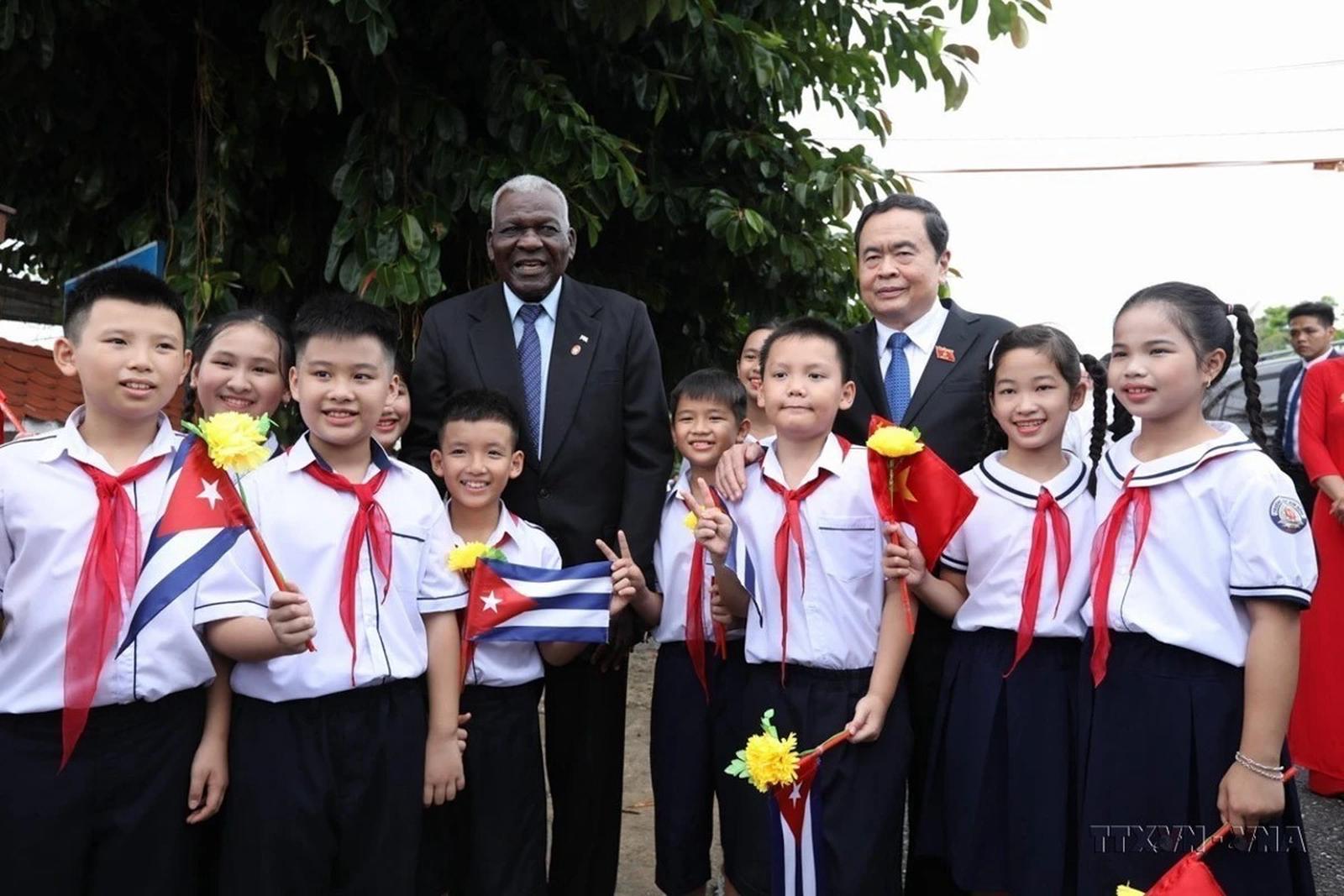 Chủ tịch Quốc hội Cuba Esteban Lazo Hernandez và Phó Chủ tịch thường trực Quốc hội Trần Thanh Mẫn với thiếu nhi tỉnh Quảng Trị tại Khu di tích quốc gia đặc biệt Đôi bờ Hiền Lương-Bến Hải ngày 26/9/2023. (Ảnh: Minh Quyết/TTXVN)