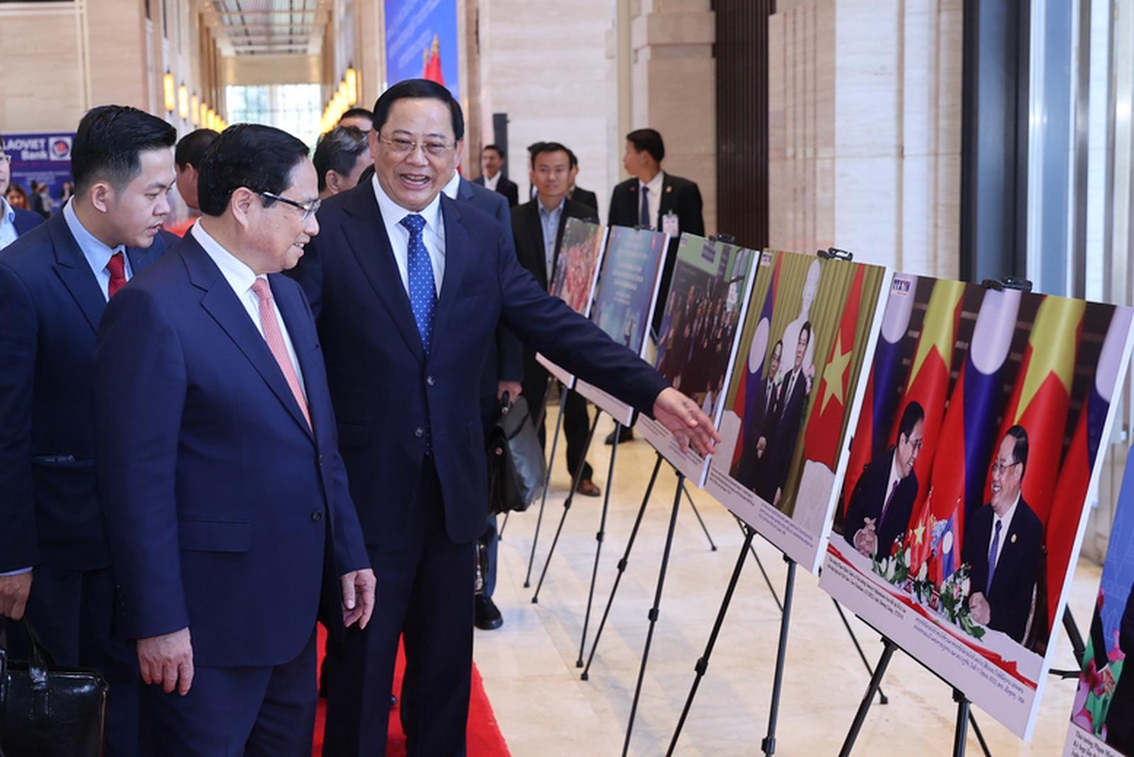 Thủ tướng Lào giới thiệu với Thủ tướng Phạm Minh Chính một số hình ảnh về hợp tác song phương Việt Nam-Lào. Ảnh: VGP/Nhật Bắc