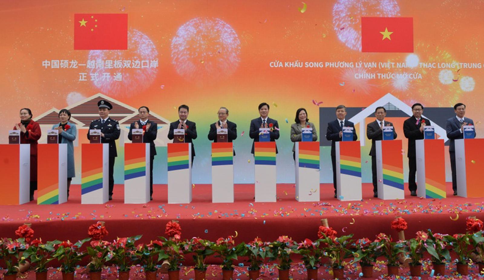 Đại biểu hai bên bấm nút khởi động thông quan cửa khẩu song phương Lý Vạn (Việt Nam) - Thạc Long (Trung Quốc). Ảnh: BCB