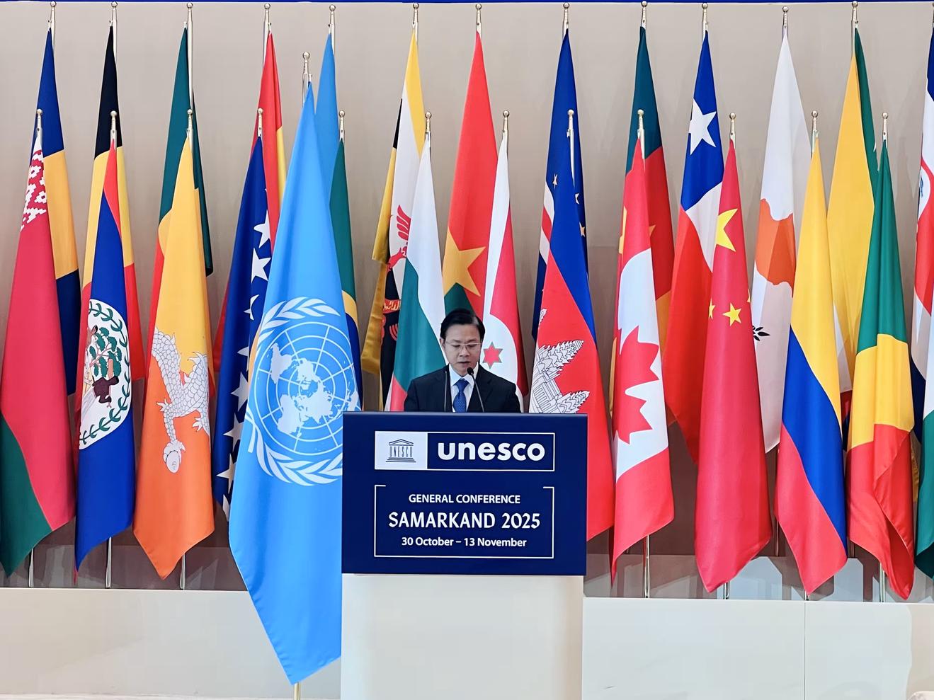 Thứ trưởng Bộ Ngoại giao Ngô Lê Văn phát biểu chính sách tại Phiên toàn thể Kỳ họp Đại hội đồng UNESCO lần thứ 43. Ảnh: BNG