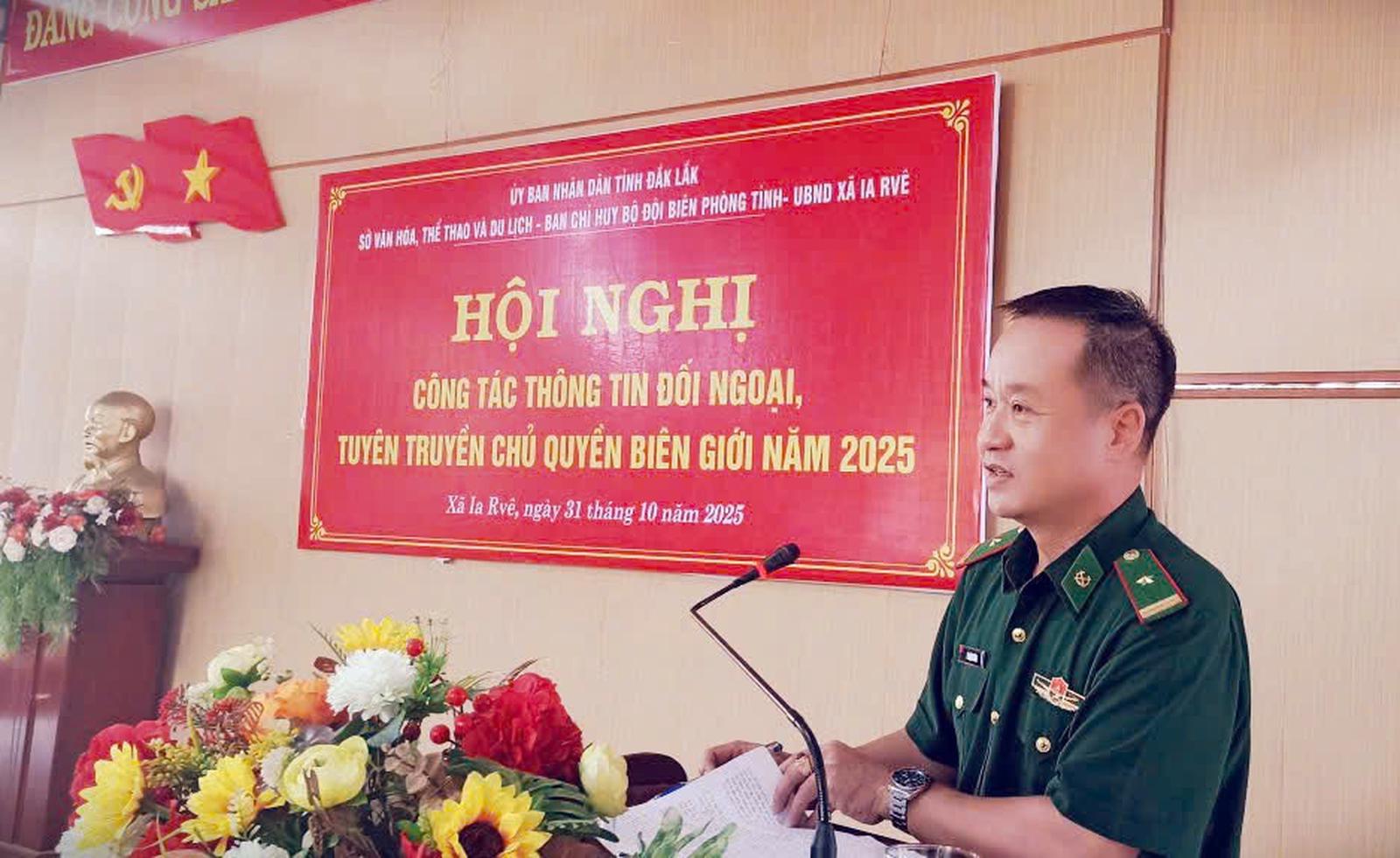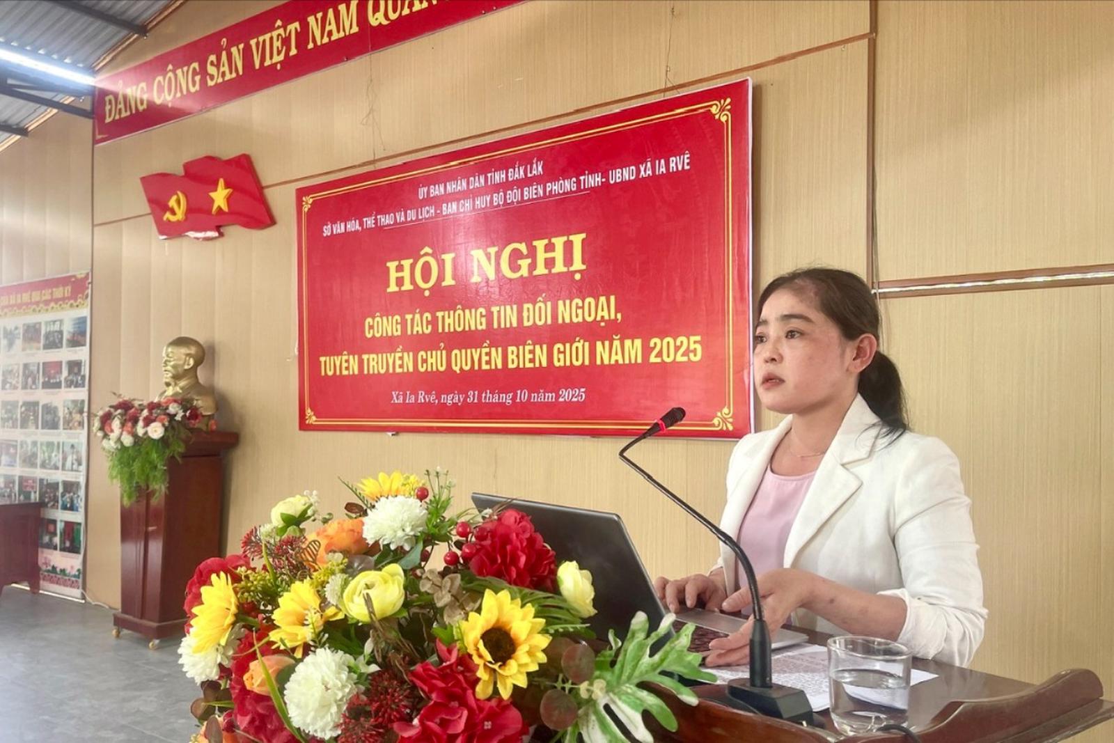 Ngày 31/10, tại hội trường UBND xã Ia Rvê, tỉnh Đắk Lắk, Sở Văn hóa, Thể thao và Du lịch (VHTTDL) tỉnh đã phối hợp với Ban Chỉ huy Bộ đội Biên phòng tỉnh tổ chức Hội nghị tuyên truyền công tác thông tin đối ngoại (TTĐN) và tuyên truyền chủ quyền biên giới năm 2025.