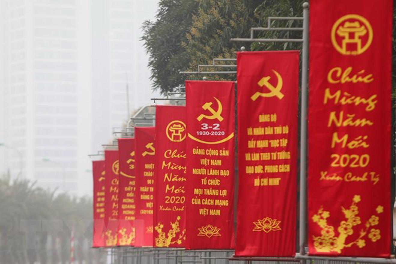 Khẩu hiệu được trang trí tại Trung tâm Hội nghị Quốc gia chào mừng kỷ niệm 90 năm Ngày thành lập Đảng Cộng sản Việt Nam. (Ảnh: Thành Đạt/TTXVN)