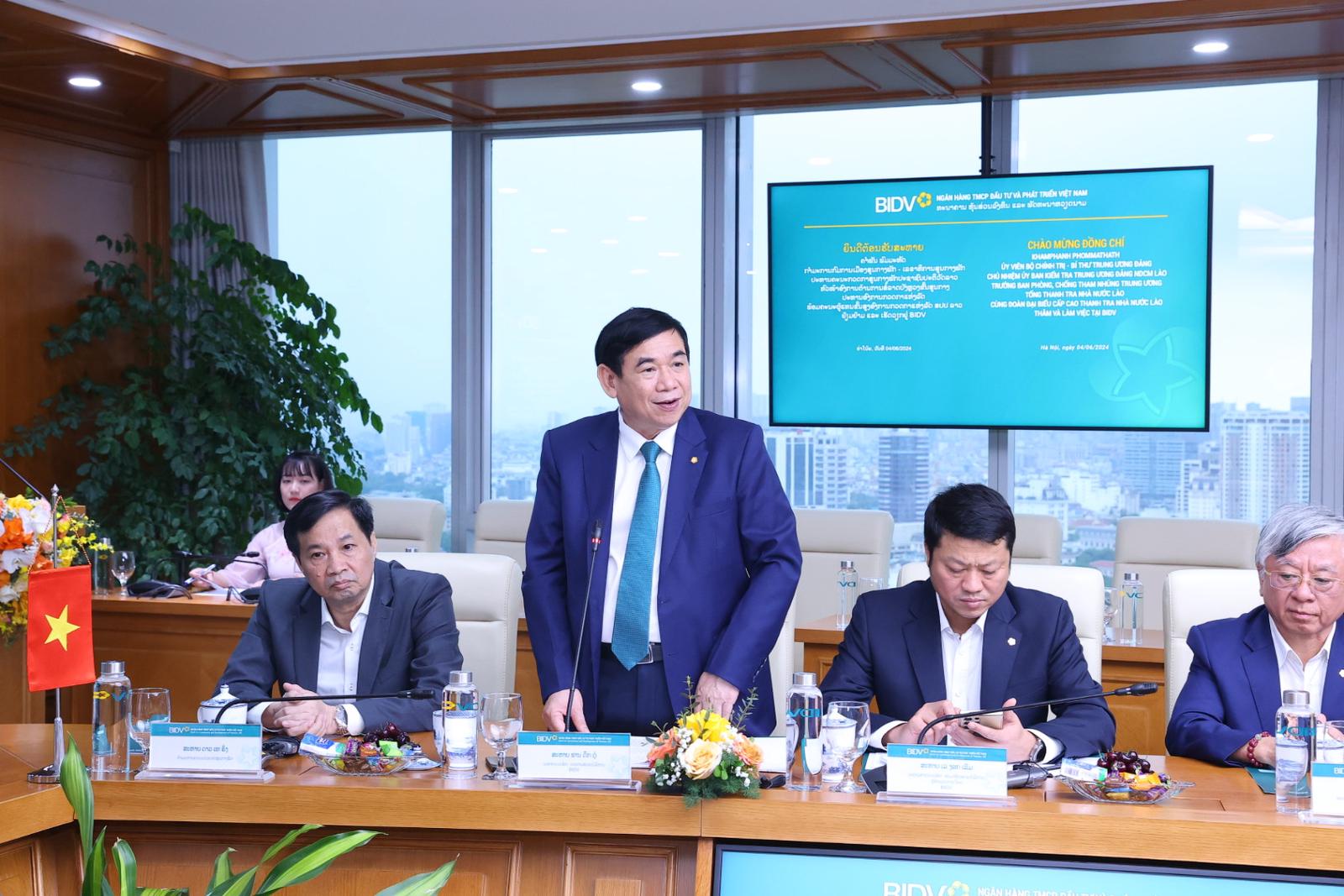 Cảm ơn sự đón tiếp trọng thị của BIDV, Tổng Thanh tra Nhà nước Lào ông Khăm Phăn Phôm - Mạ - Thắt đã chia sẻ về sự hình thành và phát triển của BIDV cũng như tình hình phát triển hợp tác đầu tư tại Lào. Đồng thời, chúc BIDV ngày càng gặt hái được nhiều thành công và phát triển to lớn hơn nữa.