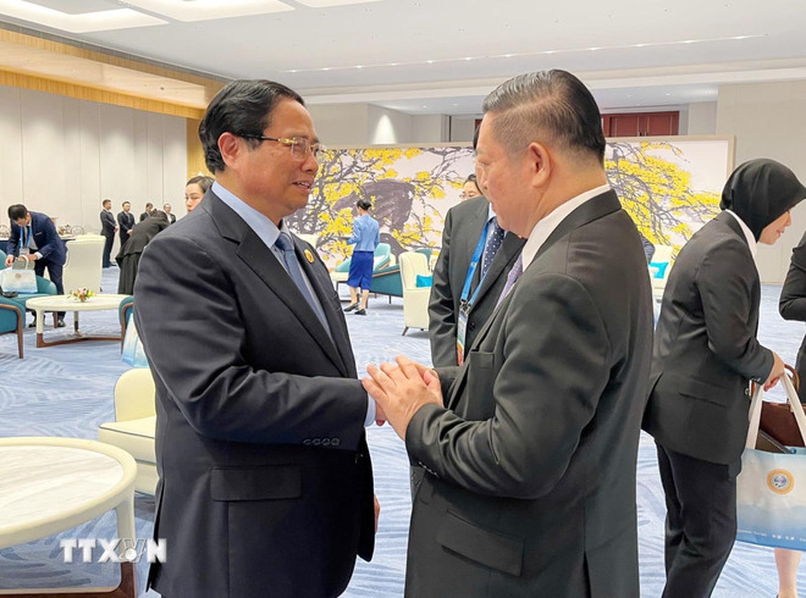 Thủ tướng Phạm Minh Chính gặp ngắn Thủ tướng Campuchia Hun Manet. Ảnh: TTXVN