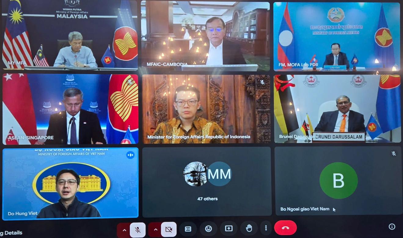 Hội nghị khẩn trực tuyến của các Bộ trưởng Ngoại giao ASEAN về khắc phục hậu quả động đất ở Myanmar và Thái Lan. Ảnh: N.G