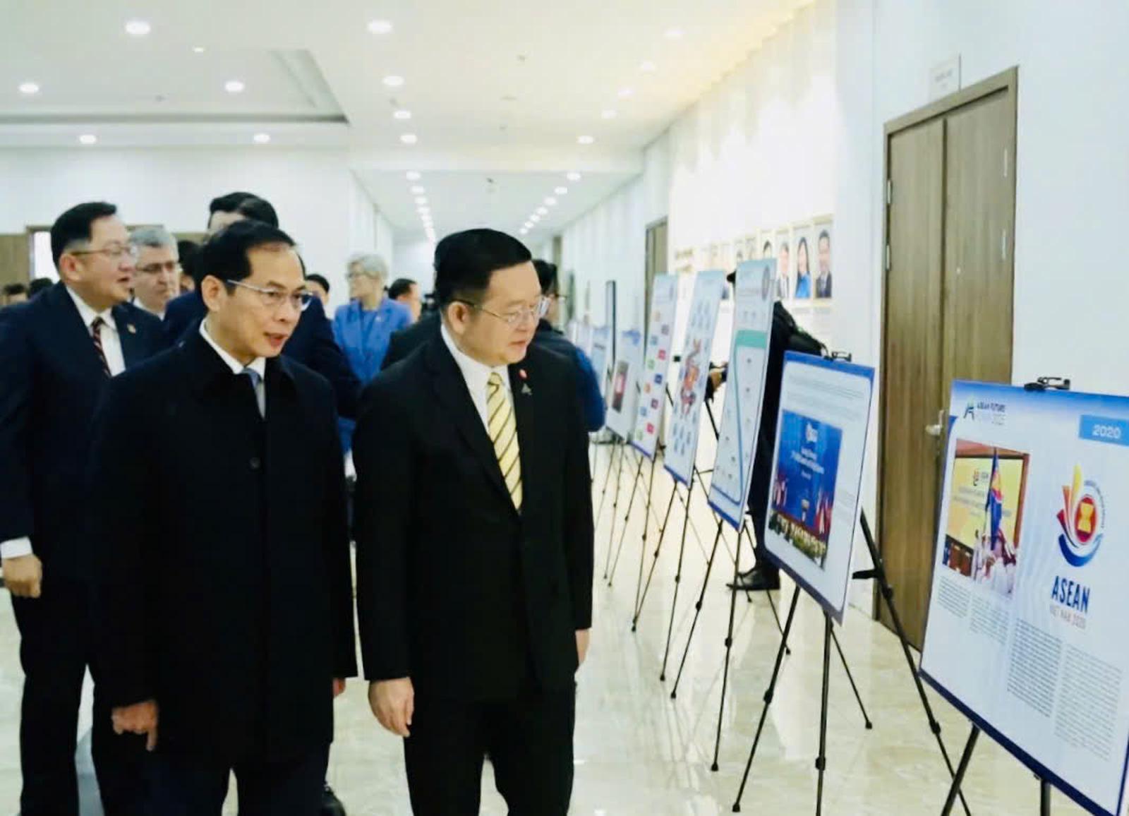 Phó Thủ tướng Chính phủ, Bộ trưởng Ngoại giao Bùi Thanh Sơn, Tổng Thư ký ASEAN Kao Kim Hourn và các đại biểu tham quan triển lãm. Ảnh: Q.Hòa