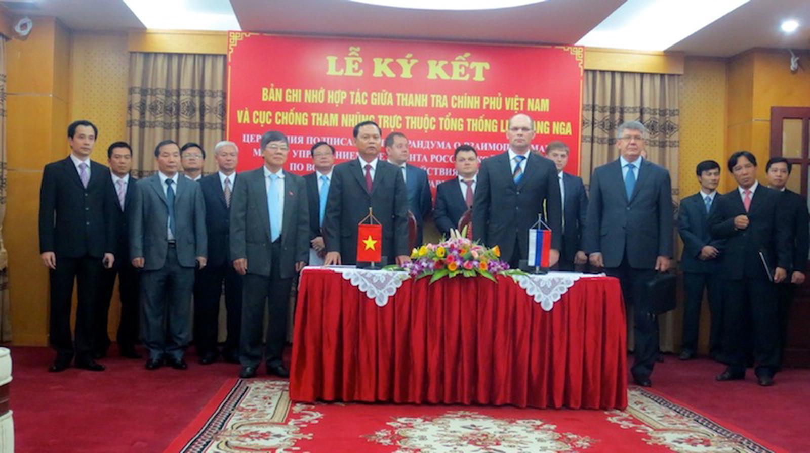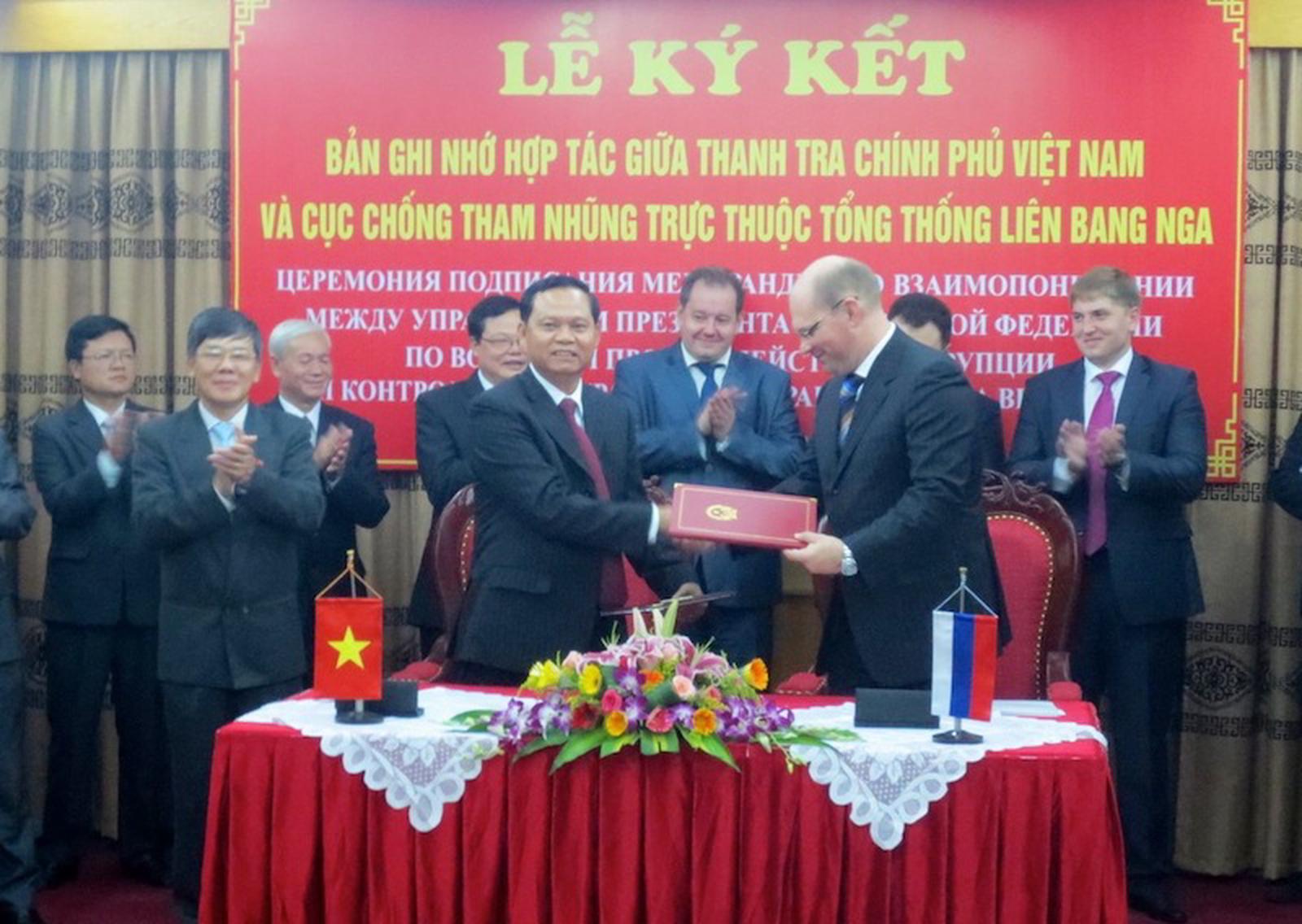 Tổng Thanh tra Chính phủ và Cục trưởng Cục chống tham nhũng Liên bang Nga trao đổi Bản ghi nhớ. Ảnh: Nguyễn Dung