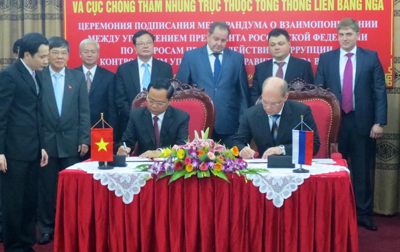 Tổng Thanh tra Chính phủ ký kết Biên bản hợp tác với Cục trưởng Cục Chống tham nhũng Liên bang Nga. Ảnh: Nguyễn Dung