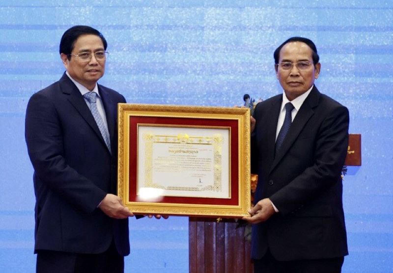 Phó Chủ tịch nước Lào trao Huân chương Vàng Quốc gia của Lào cho Thủ tướng Chính phủ Phạm Minh Chính. Ảnh: TTXVN