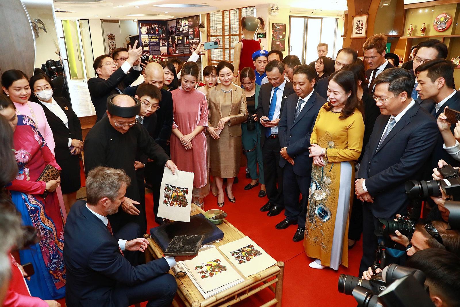 Thái tử kế vị Đan Mạch Frederik trải nghiệm nghệ thuật tranh dân gian Đông Hồ. Ảnh: Ảnh: Giang Huy Năm 2022 còn chứng kiến rất nhiều chuyến thăm giàu xúc cảm tới Việt Nam như chuyến thăm của Thái tử kế vị Đan Mạch Frederik tới Việt Nam hồi đầu tháng 11. Với ông, đây là cuộc trở về chứ không phải là chuyến thăm ngoại giao đơn thuần. Ấy là bởi, gia đình Hoàng gia của ông, với đất nước hình chữ S, đã có mối duyên nợ từ hơn nửa thế kỷ trước. Đó còn là chuyến thăm của Thủ tướng New Zealand Jacinda Ardern tới đất nước mà bà đã thốt lên đầy cảm kích là đối tác "trời sinh"; là chuyến thăm của Thủ tướng Malaysia tới Việt Nam trước cả khi Malaysia quyết định mở cửa biên giới hoàn toàn sau đại dịch Covid-19 (1/4)… Đó còn là chuyến thăm thu được nhiều kết quả quan trọng của các nhà lãnh đạo Việt Nam tới các nước như: Chuyến thăm Hàn Quốc, Singapore, Thái Lan… của Chủ tịch nước, chuyến thăm một số nước châu Âu của Chủ tịch Quốc hội Vương Đình Huệ…