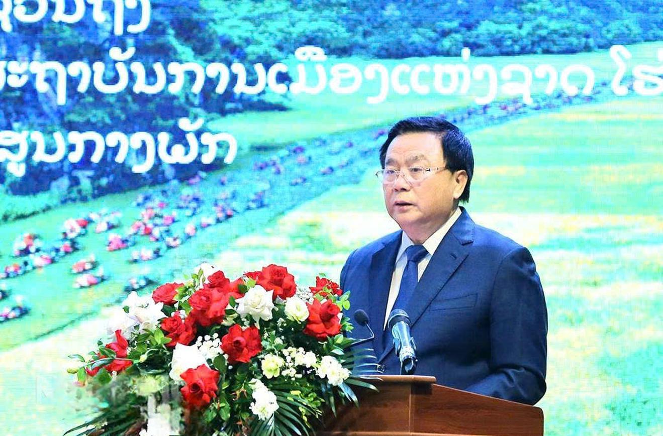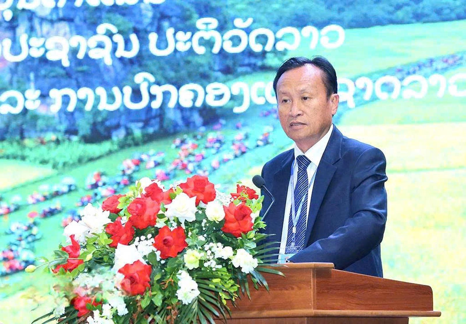 PGS. Phu - vông Ủn - khăm - sẻn, Ủy viên Trung ương Đảng Nhân dân Cách mạng Lào, Giám đốc Học viện Chính trị và Hành chính Quốc gia Lào phát biểu tại Hội thảo. Ảnh: BNB