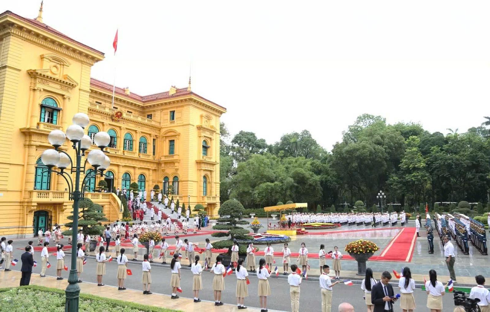 Toàn cảnh lễ đón Tổng thống Emmanuel Macron và Phu nhân cùng Đoàn cấp cao Cộng hòa Pháp. Ảnh: Thành Long