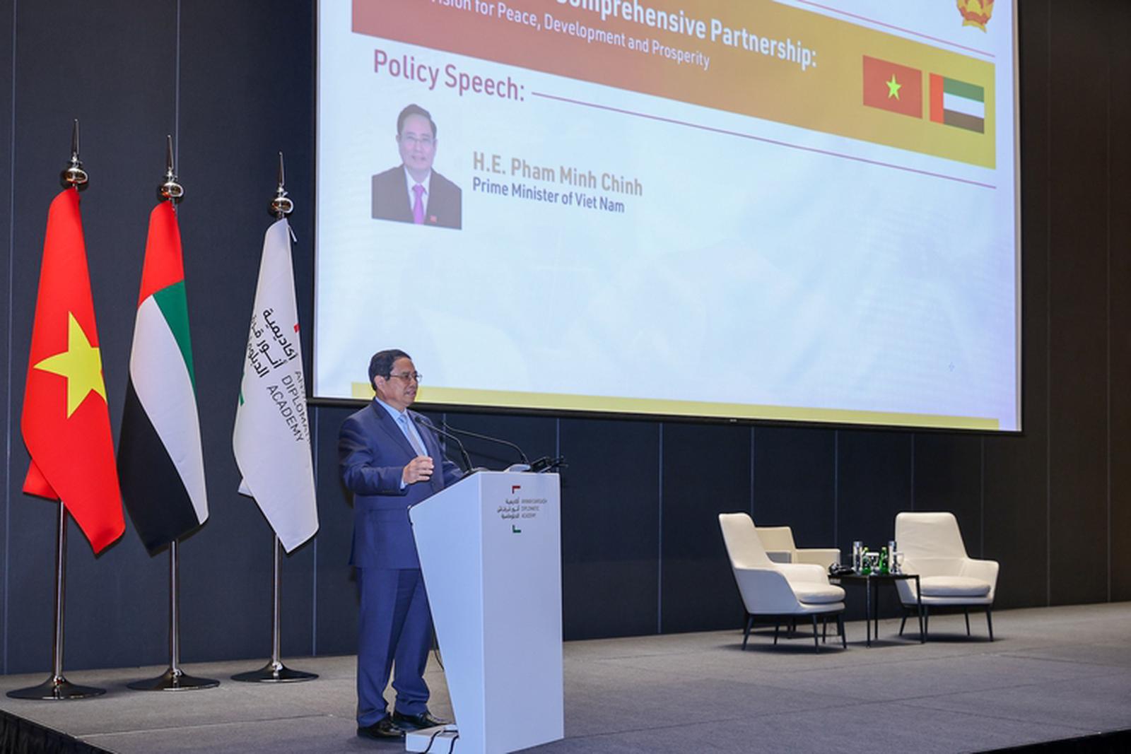 Thủ tướng Chính phủ Phạm Minh Chính vừa có bài phát biểu chính sách quan trọng tại Học viện Ngoại giao Anwar Gargash. Ảnh: Nhật Bắc
