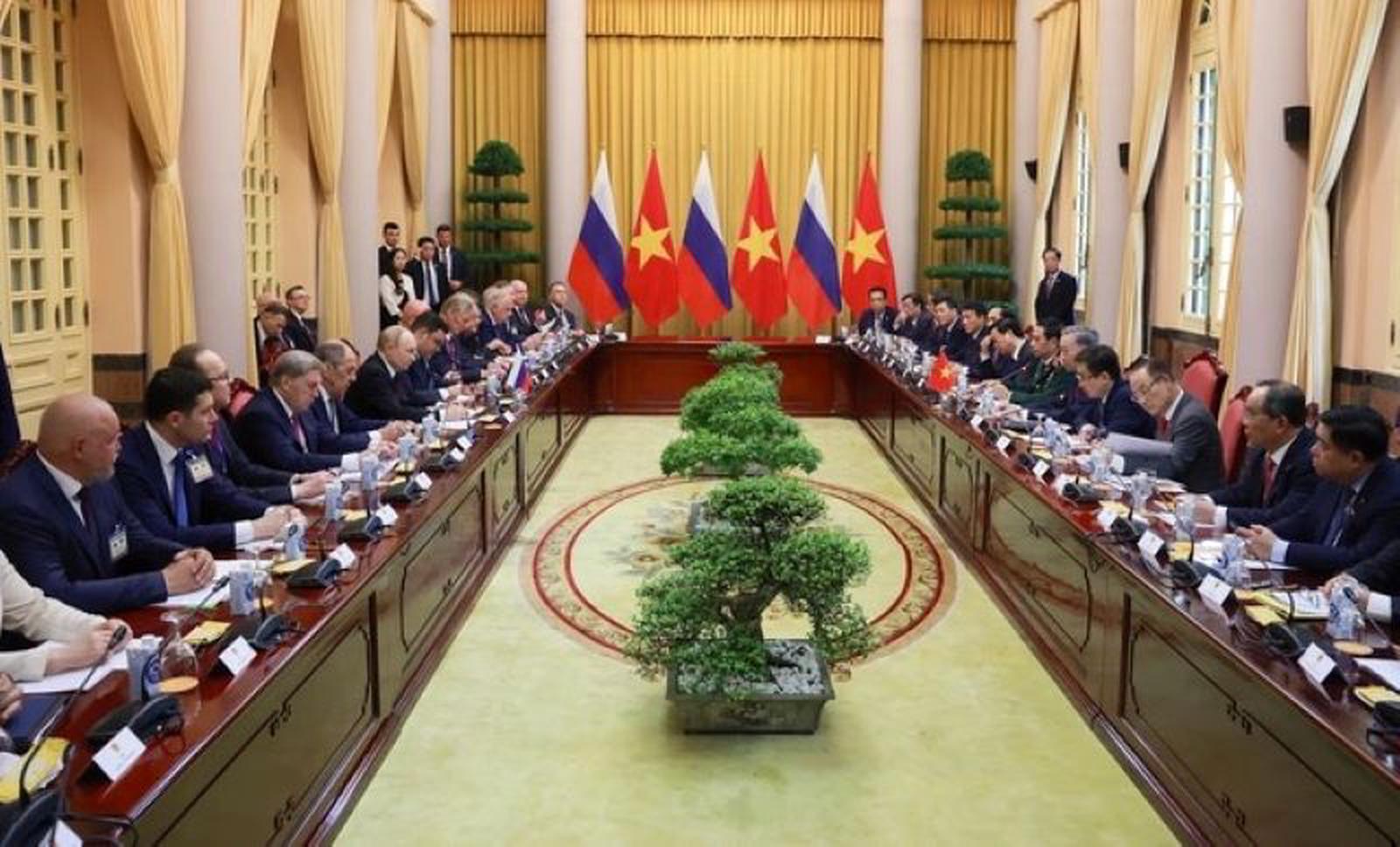 Ngay sau lễ đón chính thức, Chủ tịch nước Tô Lâm và Tổng thống Nga Vladimir Putin dẫn đầu đoàn đại biểu cấp cao hai nước tiến hành hội đàm tại Phủ Chủ tịch, đánh giá kết quả hợp tác giữa hai nước thời gian qua và đề xuất các phương hướng hợp tác thời gian tới.
