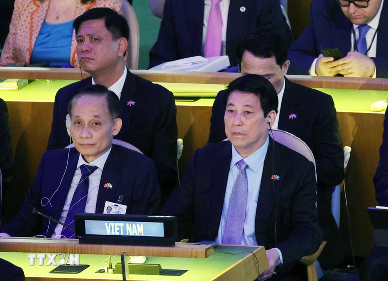 Chủ tịch nước Lương Cường và Quyền Bộ trưởng Ngoại giao Lê Hoài Trung tại sự kiện giới thiệu Lễ mở ký Công ước Hà Nội tại Tuần lễ Cấp cao ĐHĐ LHQ. Ảnh: TTXVN
