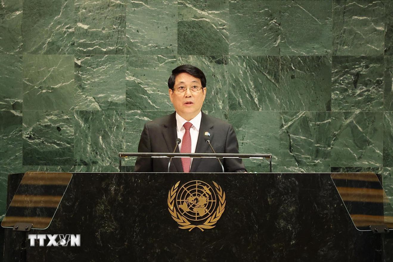 Chủ tịch nước Lương Cường phát biểu tại Phiên Thảo luận chung cấp cao Đại hội đồng Liên hợp quốc Khóa 80. Ảnh: Lâm Khánh/TTXVN