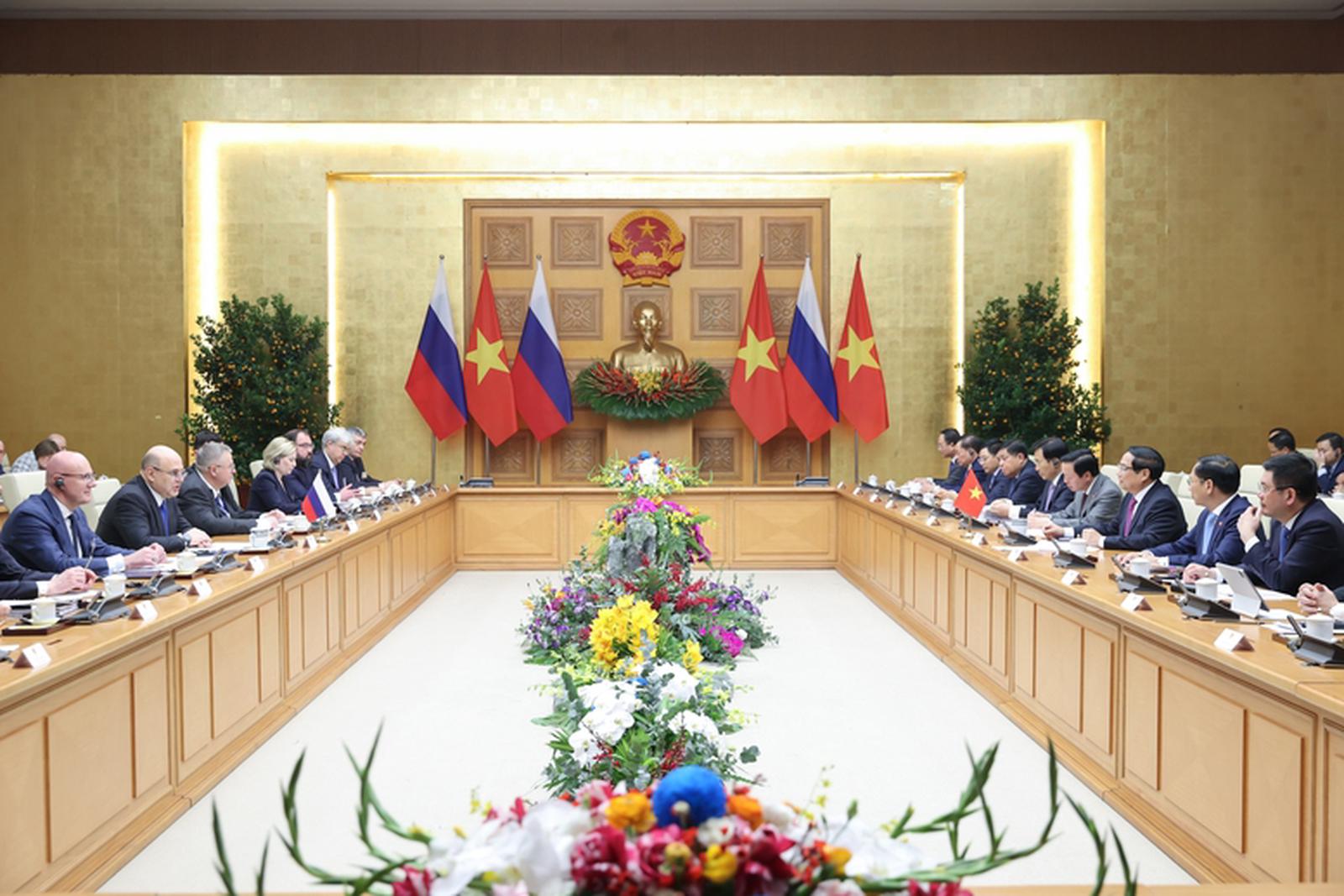 Thủ tướng Phạm Minh Chính chào mừng Thủ tướng Chính phủ Mikhail Mishustin lần đầu tiên thăm chính thức Việt Nam, khởi động cho năm kỷ niệm 75 năm thiết lập quan hệ ngoại giao giữa hai nước, đánh giá cao ý nghĩa quan trọng của chuyến thăm và tin tưởng chuyến thăm sẽ tạo động lực mạnh mẽ cho việc củng cố và làm sâu sắc hơn nữa quan hệ Đối tác chiến lược toàn diện Việt Nam - Nga trong thời gian tới.