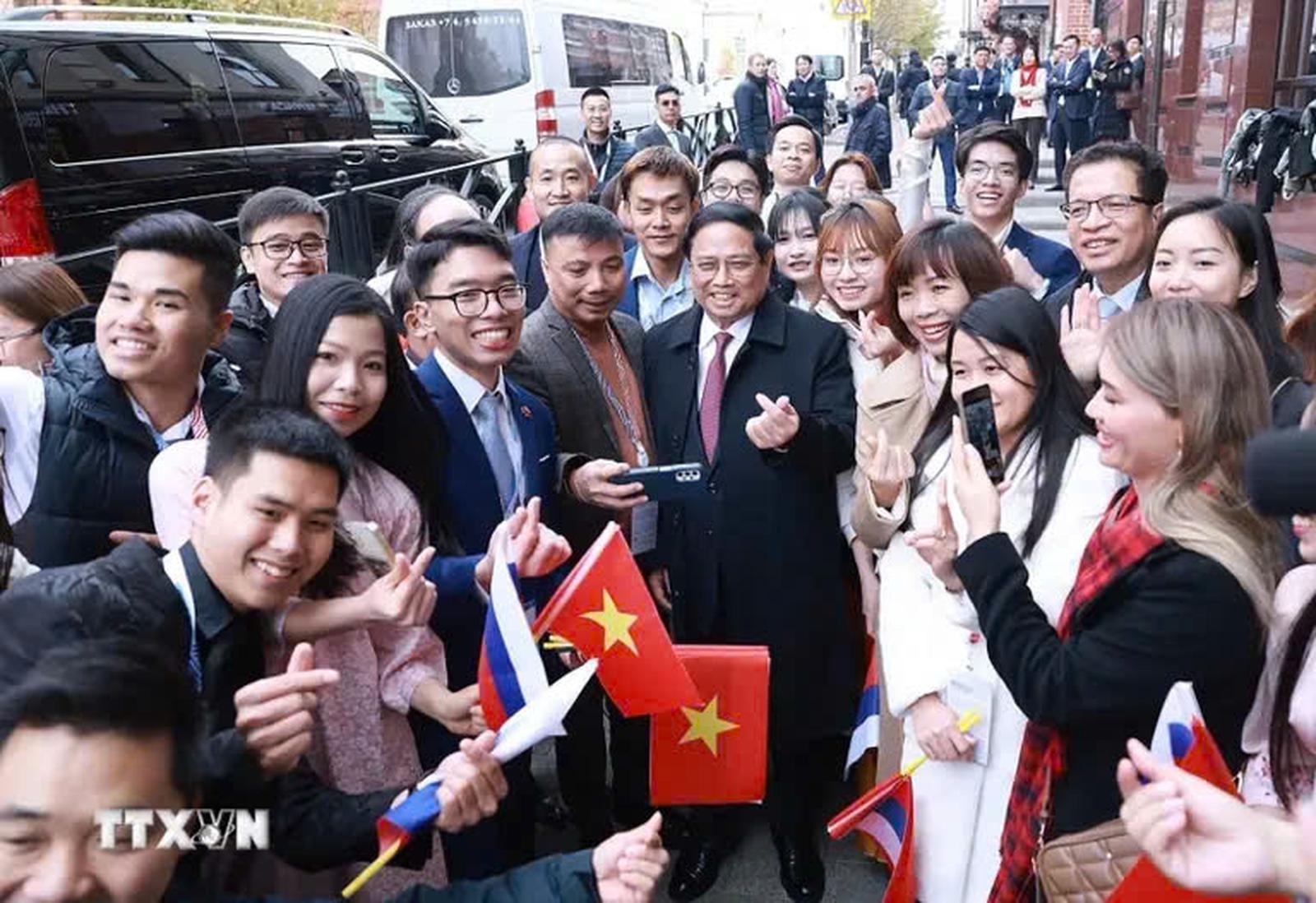 Chiều 23/10 (theo giờ địa phương), Thủ tướng Chính phủ Phạm Minh Chính đã có buổi gặp gỡ đại diện Đại sứ quán, Tổng lãnh sự quán và cộng đồng người Việt Nam tại Liên bang Nga. Ảnh: TTXVN