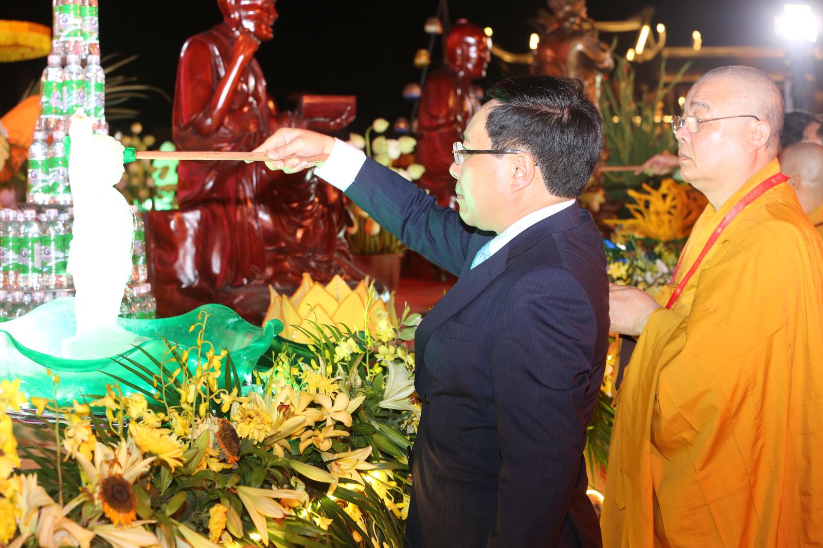 Uỷ viên Bộ Chính trị, Phó Thủ tướng Phạm Bình Minh tham dự lễ tắm Phật tại Đại lễ Vesak, tổ chức tại chùa Tam Chúc, Hà Nam, năm 2019. Ảnh: Trà Vân