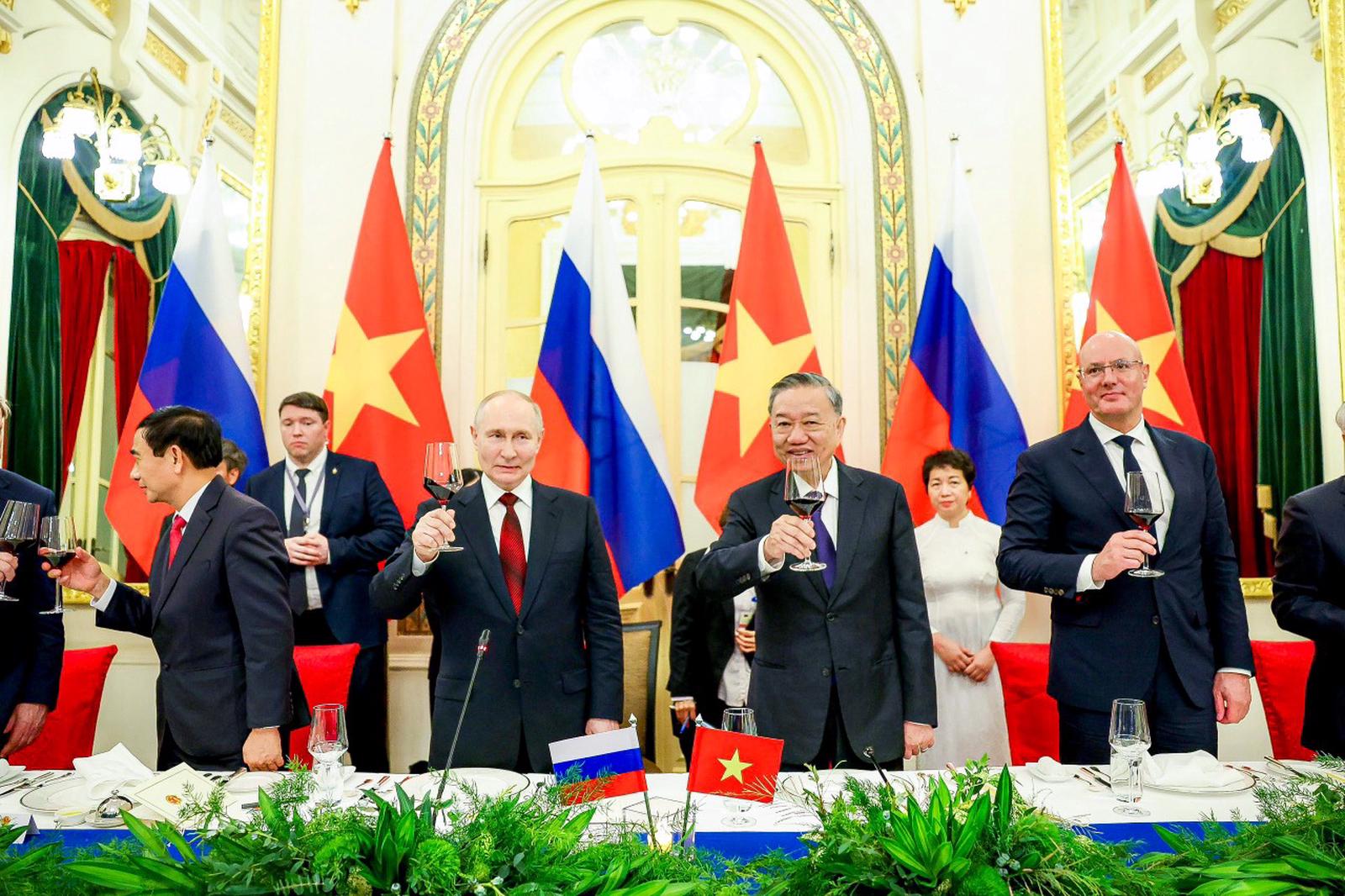 Sau cuộc gặp gỡ, Chủ tịch nước Tô Lâm đã chủ trì chiêu đãi trọng thể Tổng thống Vladimir Putin và đoàn. Ảnh: H.H