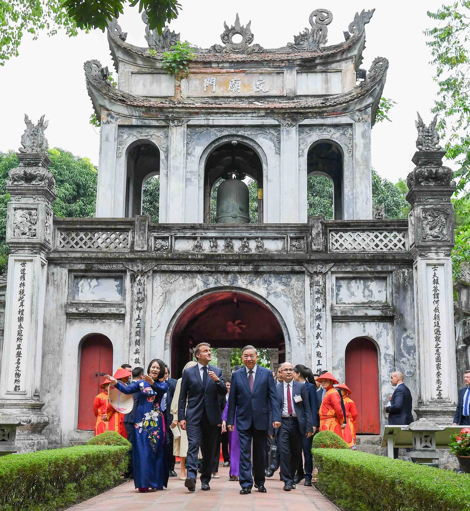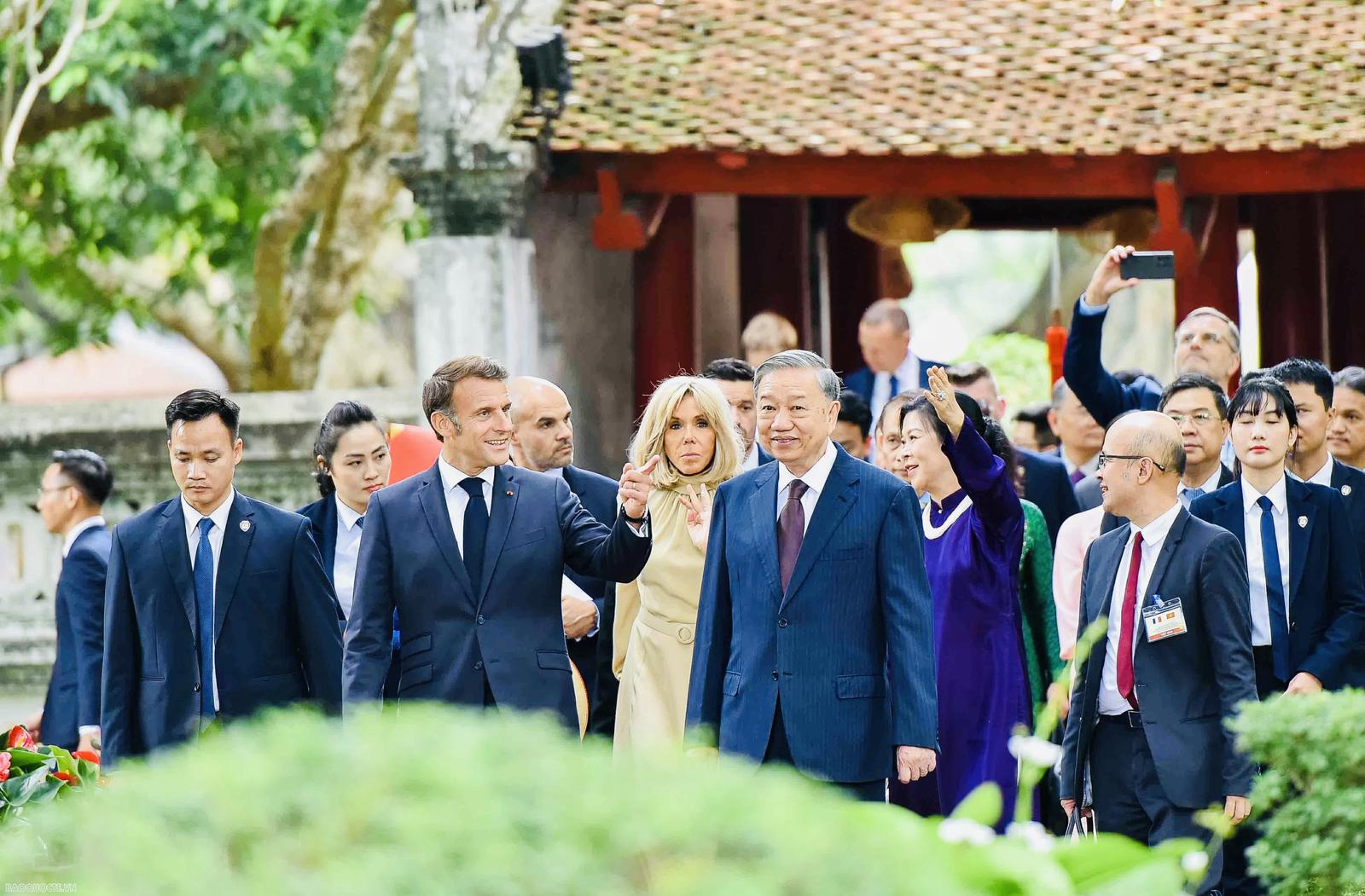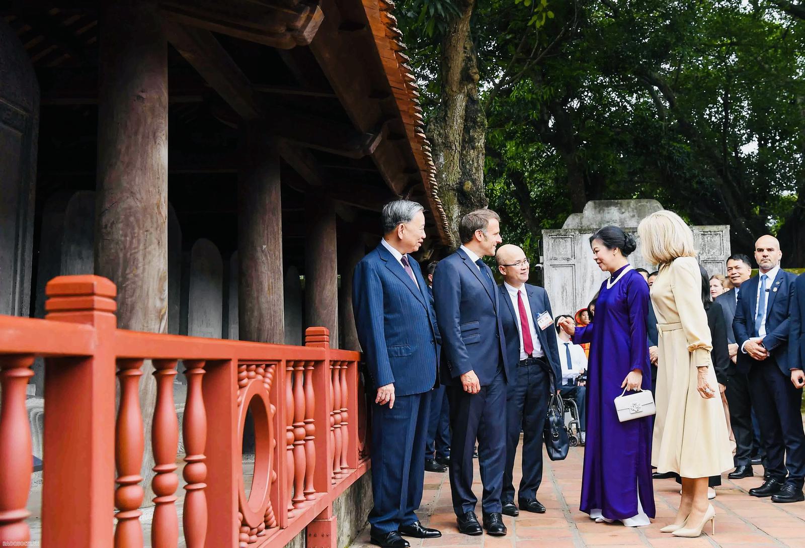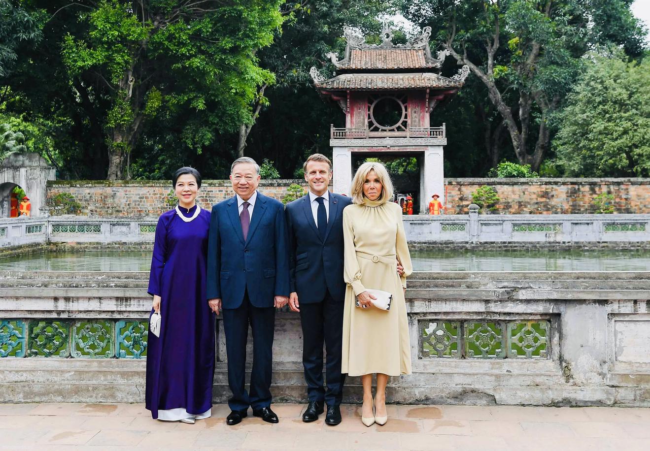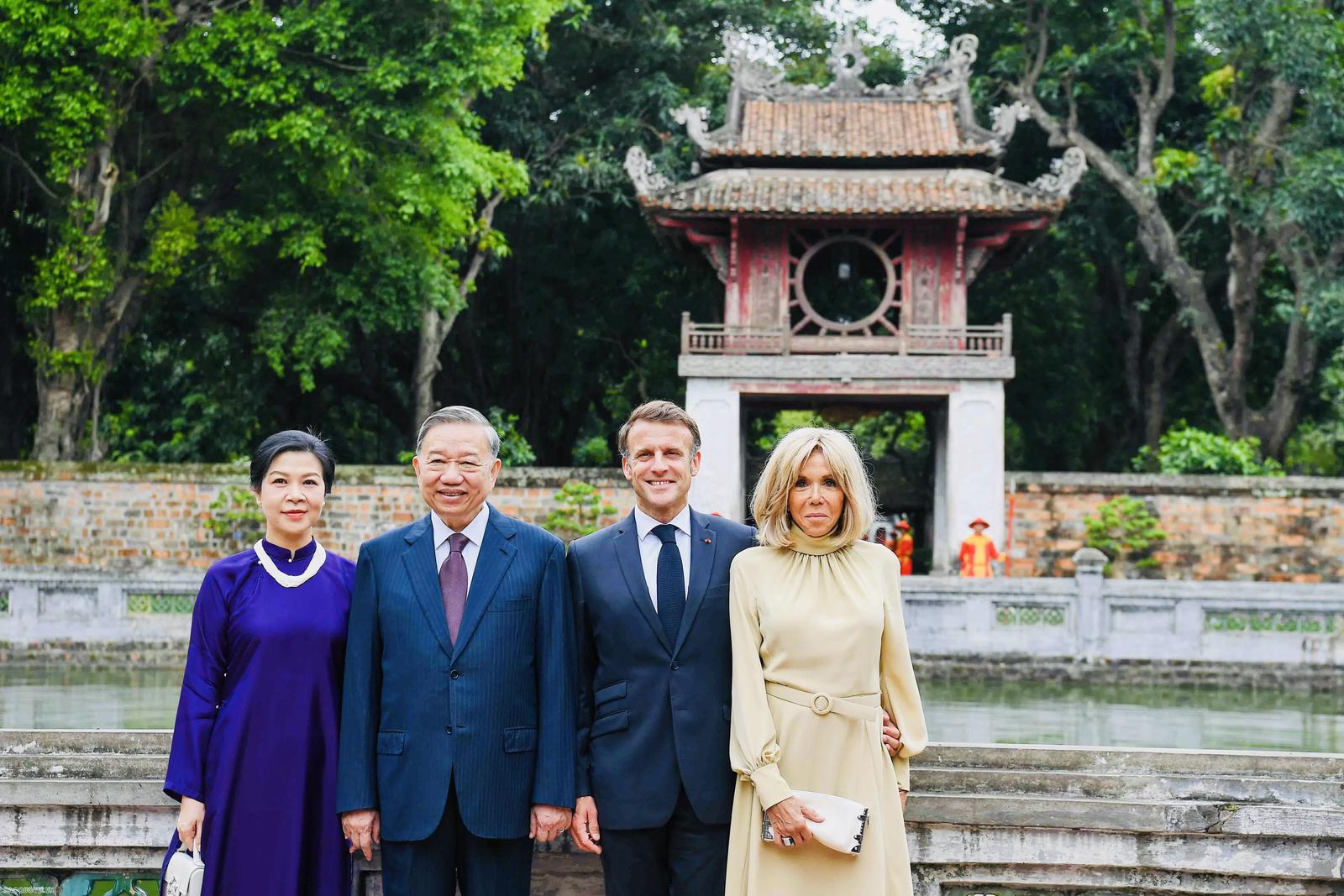 Tổng Bí thư Tô Lâm và Phu nhân cùng Tổng thống Pháp Emmanuel Macron và Phu nhân đã đến thăm Văn Miếu Quốc Tử Giám. Ảnh: Nguyên Hồng