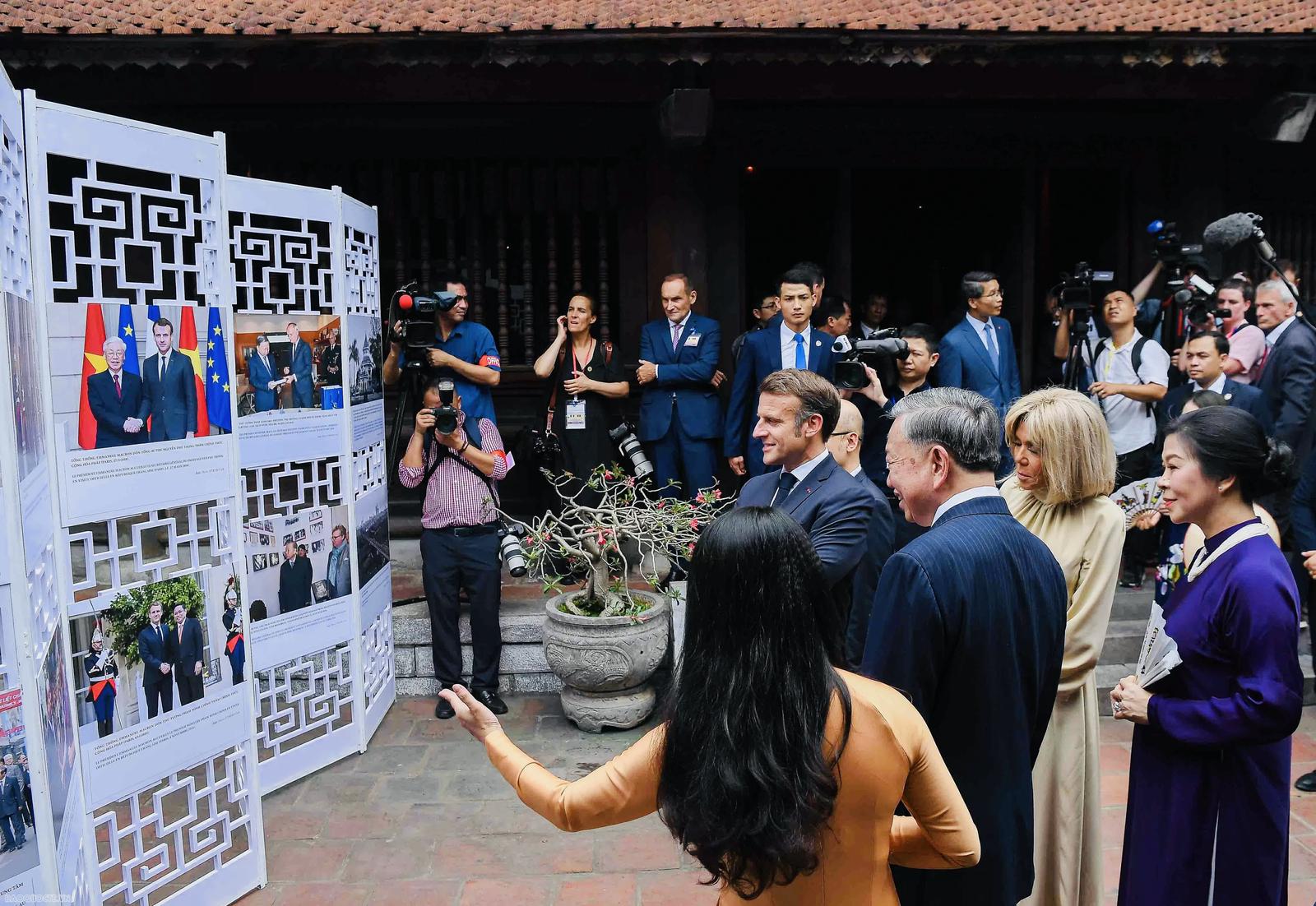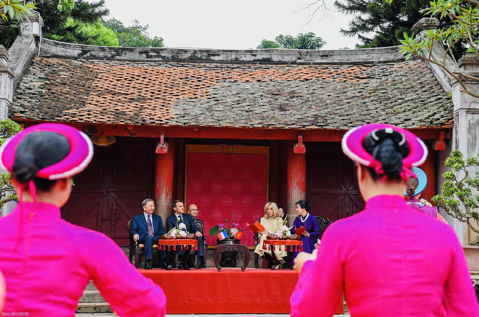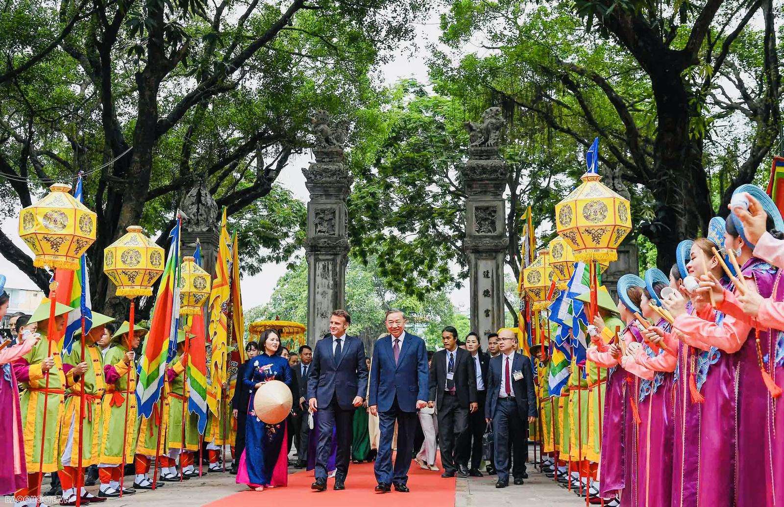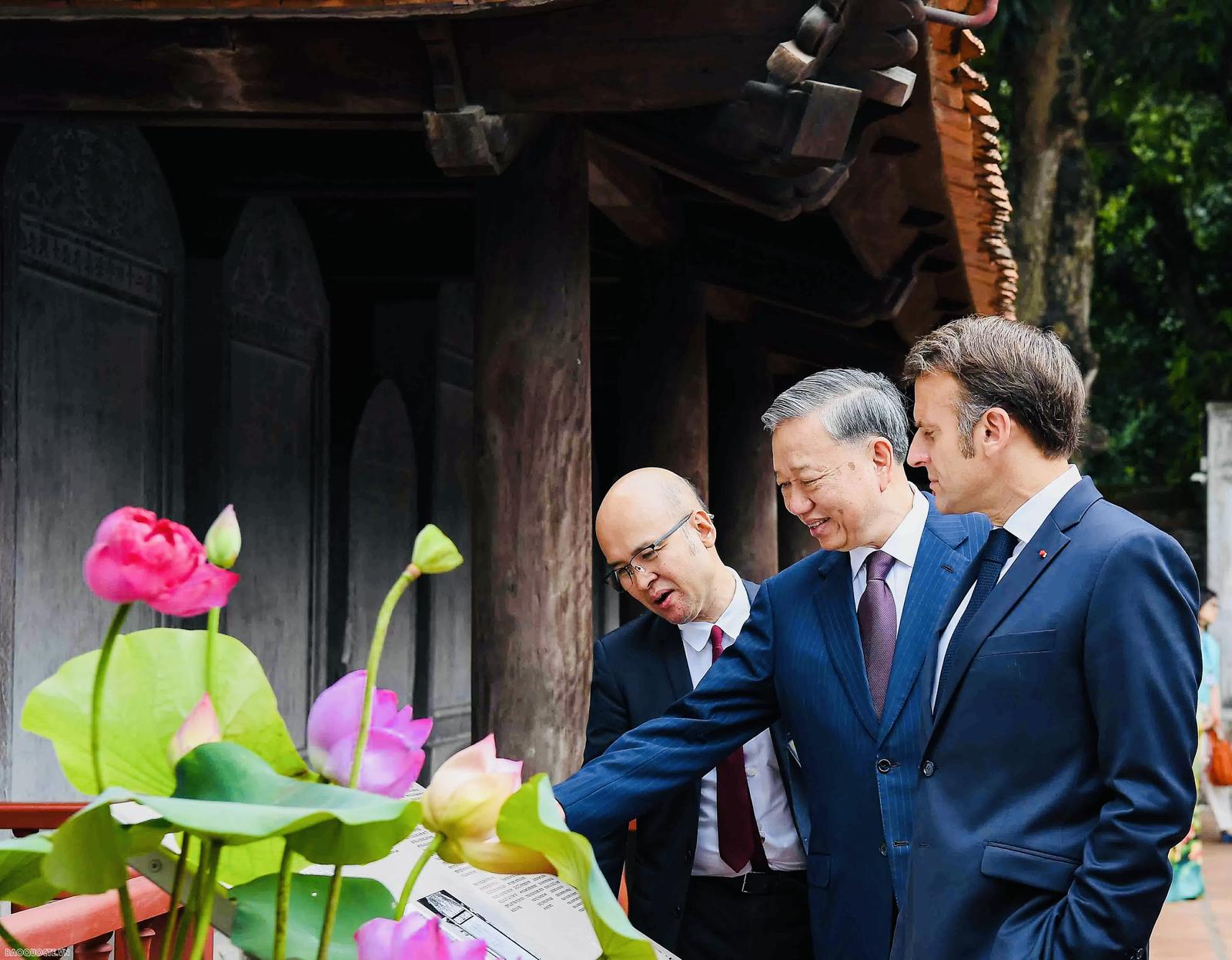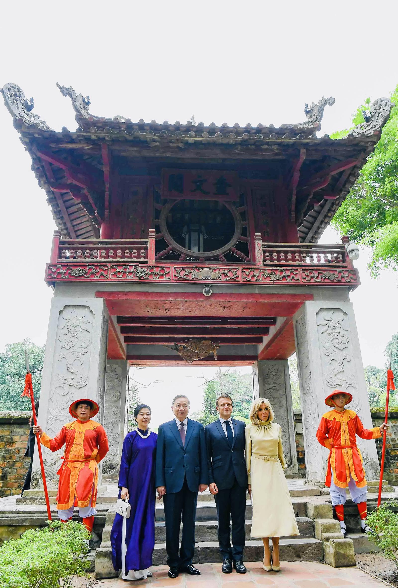 Tổng Bí thư Tô Lâm và Phu nhân cùng Tổng thống Pháp Emmanuel Macron và Phu nhân đã đến thăm Văn Miếu Quốc Tử Giám. Ảnh: Nguyên Hồng